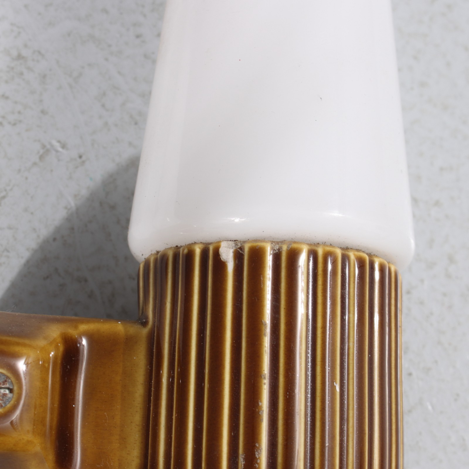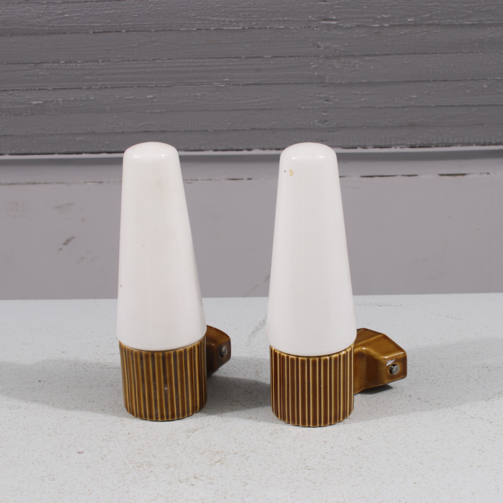 2 stycken, stengods och glas, sladdar saknas,1st mindre glasyrnagg (se bild), höjd 21 cm, djup 11 cm. (vån3)