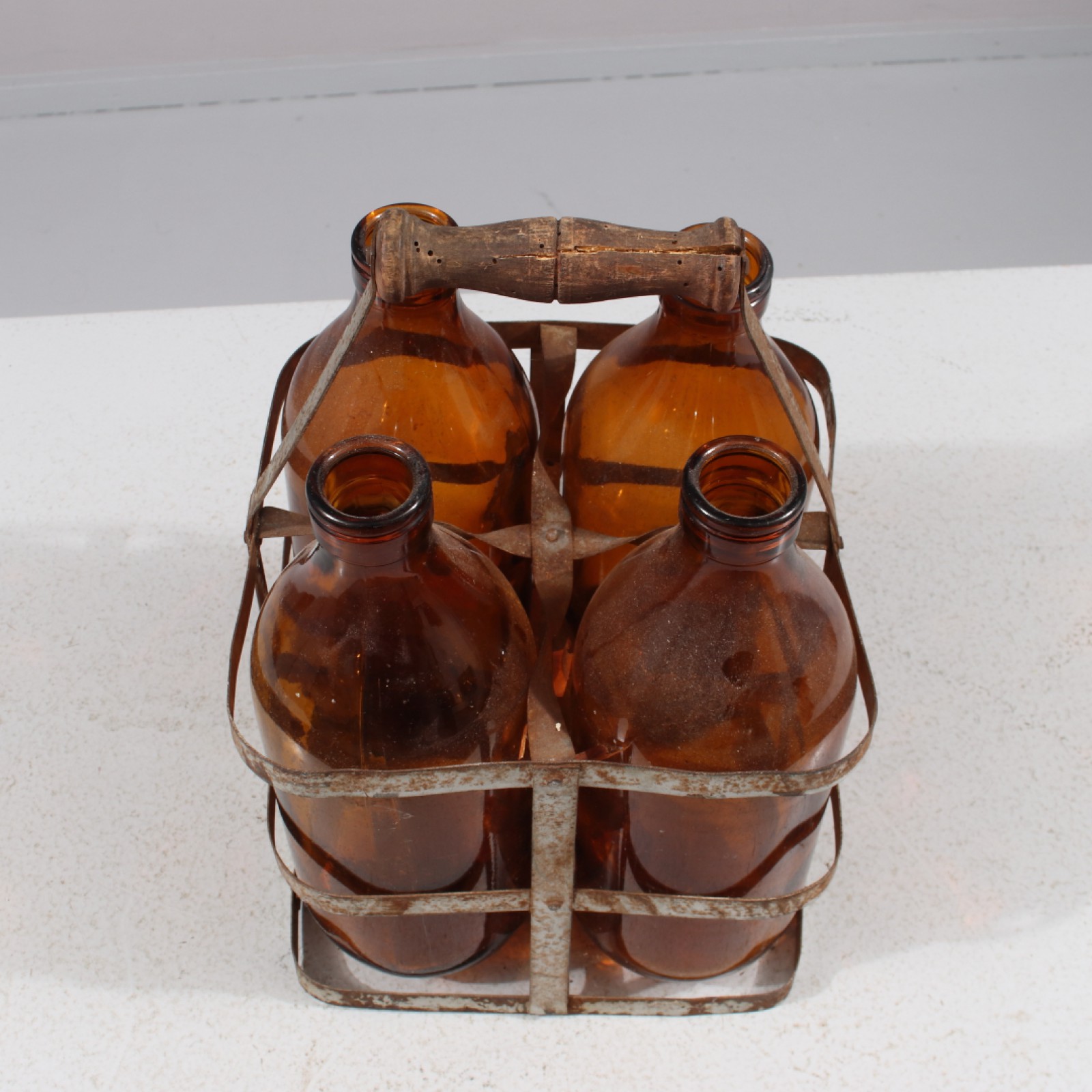 Ställning i metall och trähandtag, st flaskor i glas, ställning H.29, B.20x20 cm. (vån3)