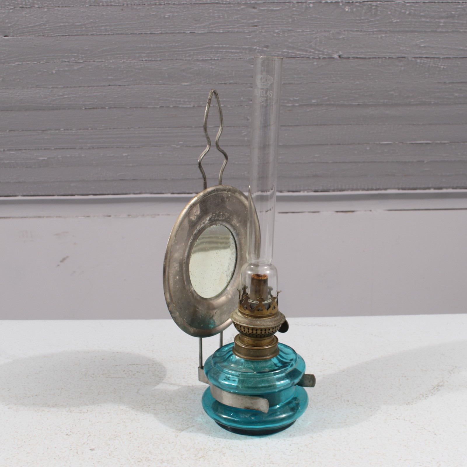 Oljehus och brännarrör i glas, reflektor i plåt och spegelglas, höjd 35 cm. (vån3)