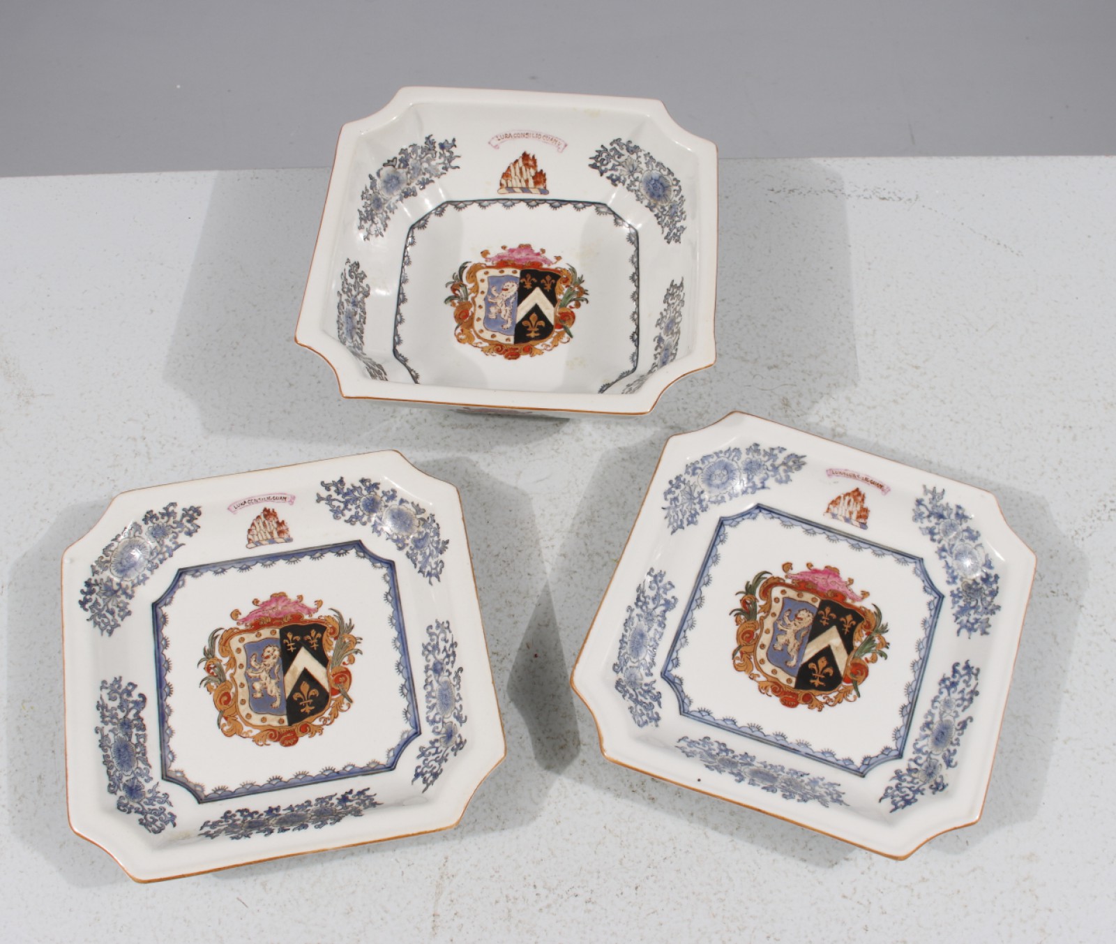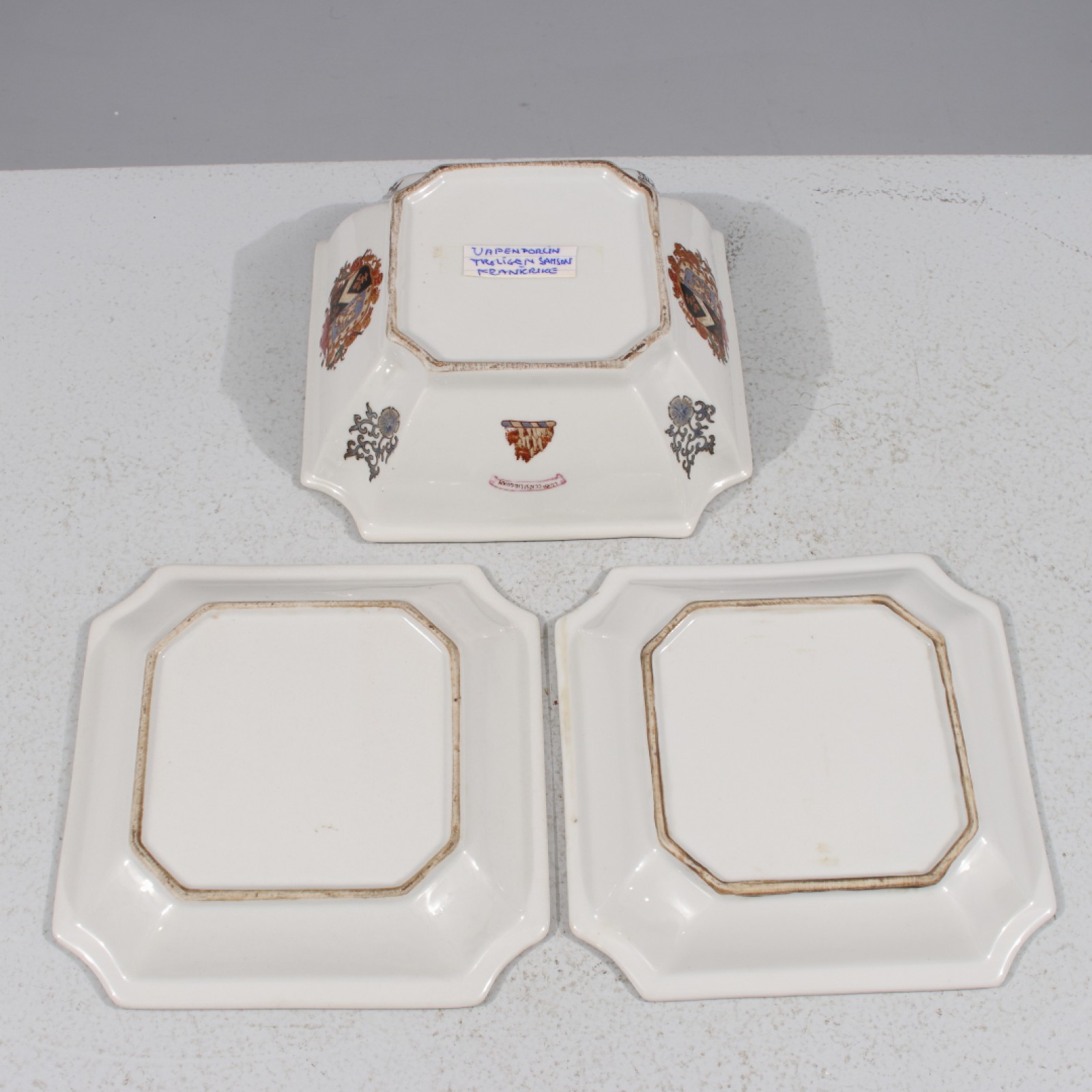 3 delar, 1st skål samt 1par fat, dekor med bl.a vapensköld, troligen Samson, bredd 19,5-20,5. (vån3)