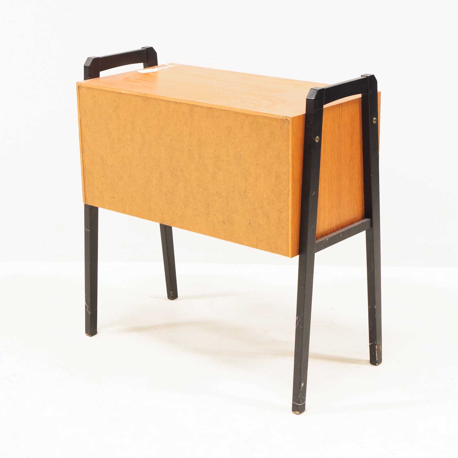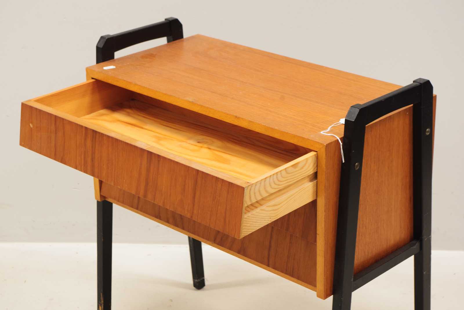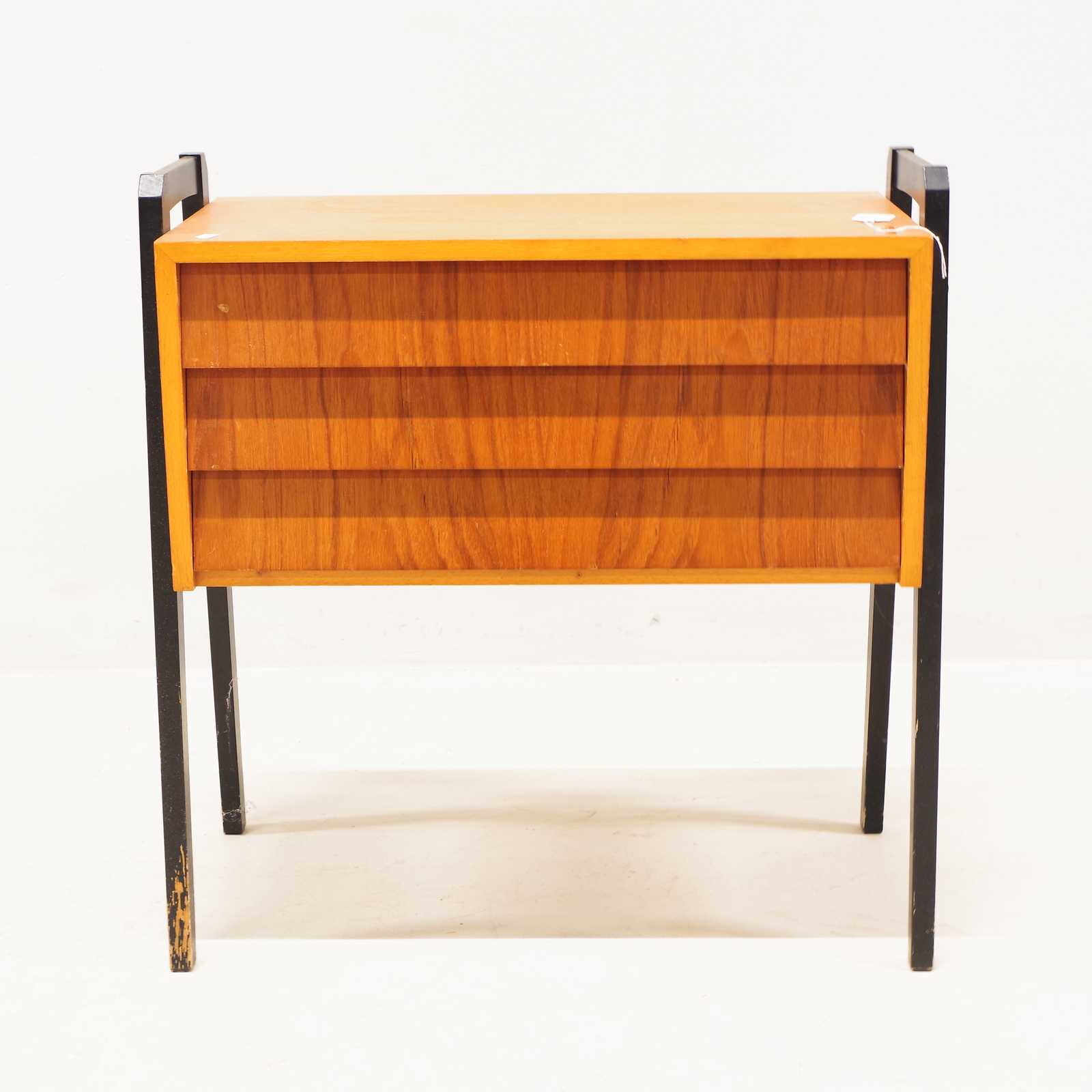 Bilder BYRÅ 3 lådig, fanerat i teak, 1900 talets mitt. H:60x 58x 28cm (bruksslitage)