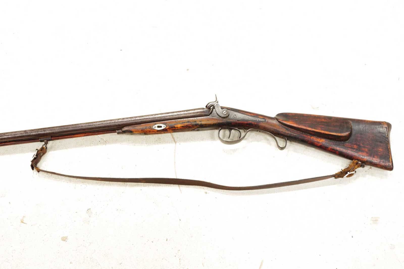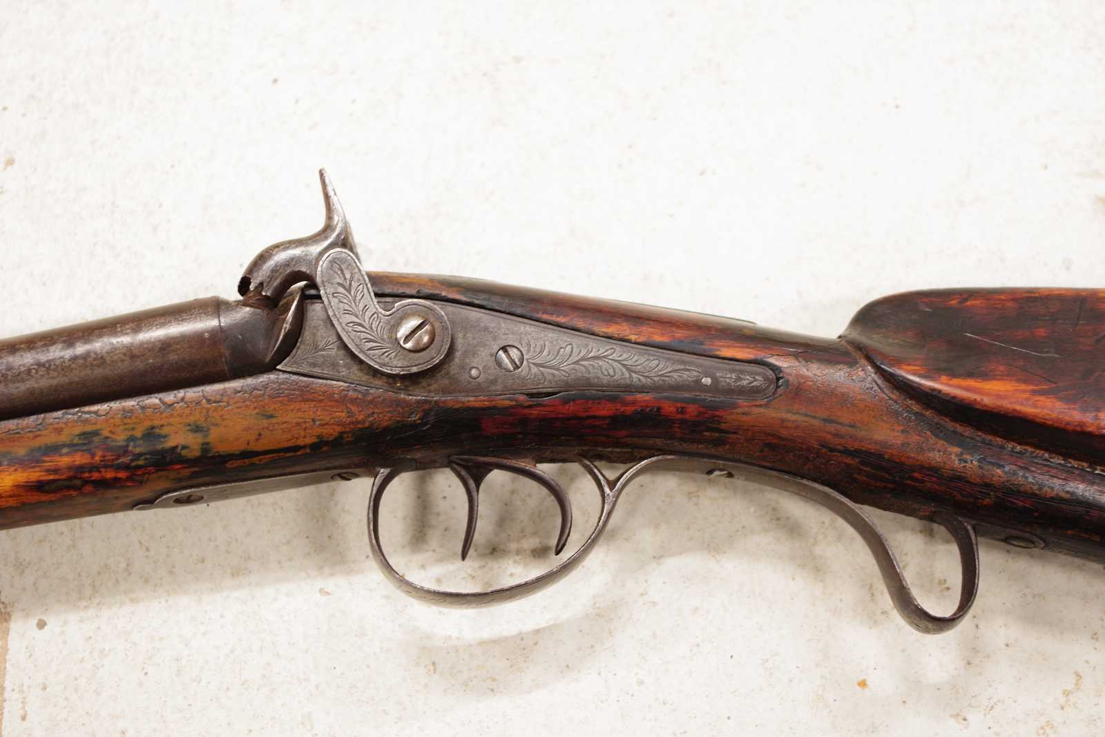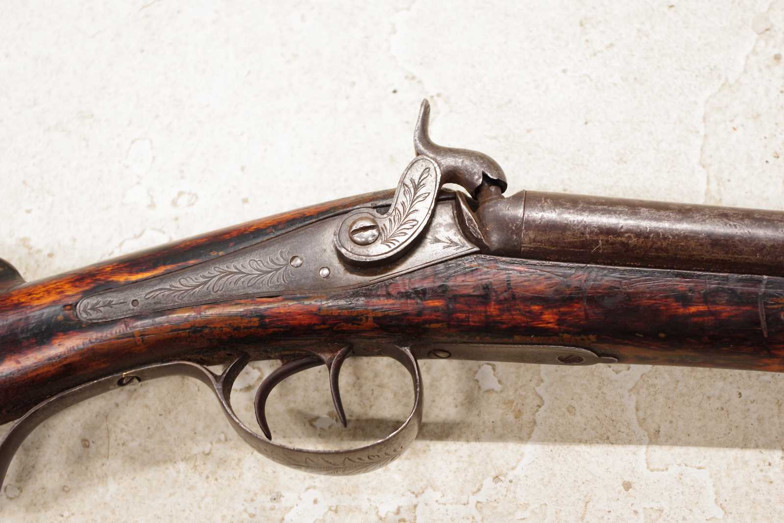 Auktioner SLAGLÅSGEVÄR dubbelpipigt 1800-tal Graverade lås, upphak för båda piporna Licensfritt gevär