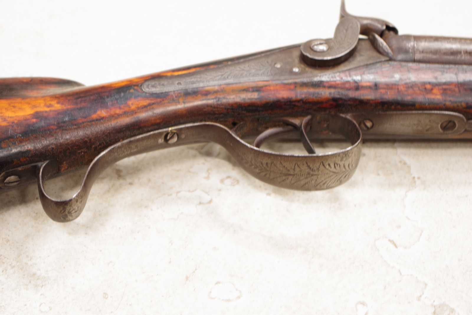 SLAGLÅSGEVÄR dubbelpipigt 1800-tal Graverade lås, upphak för båda piporna Licensfritt gevär