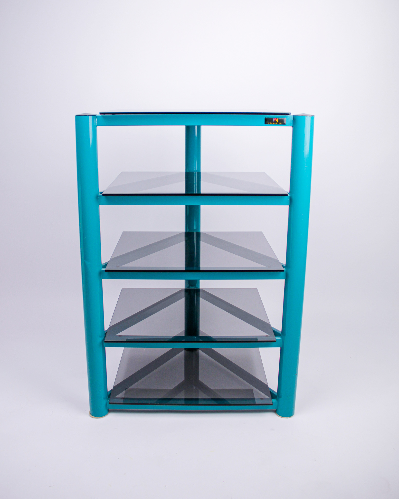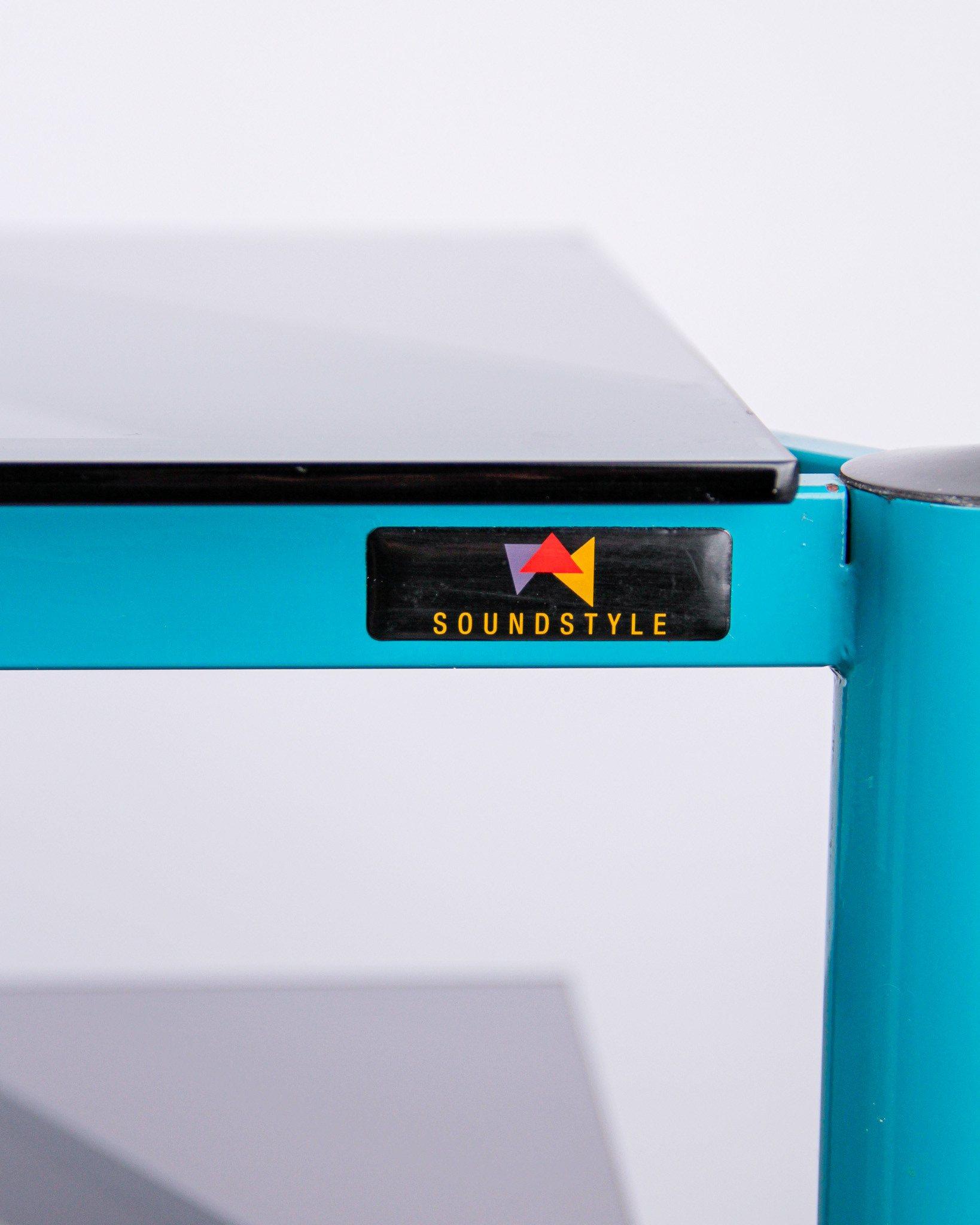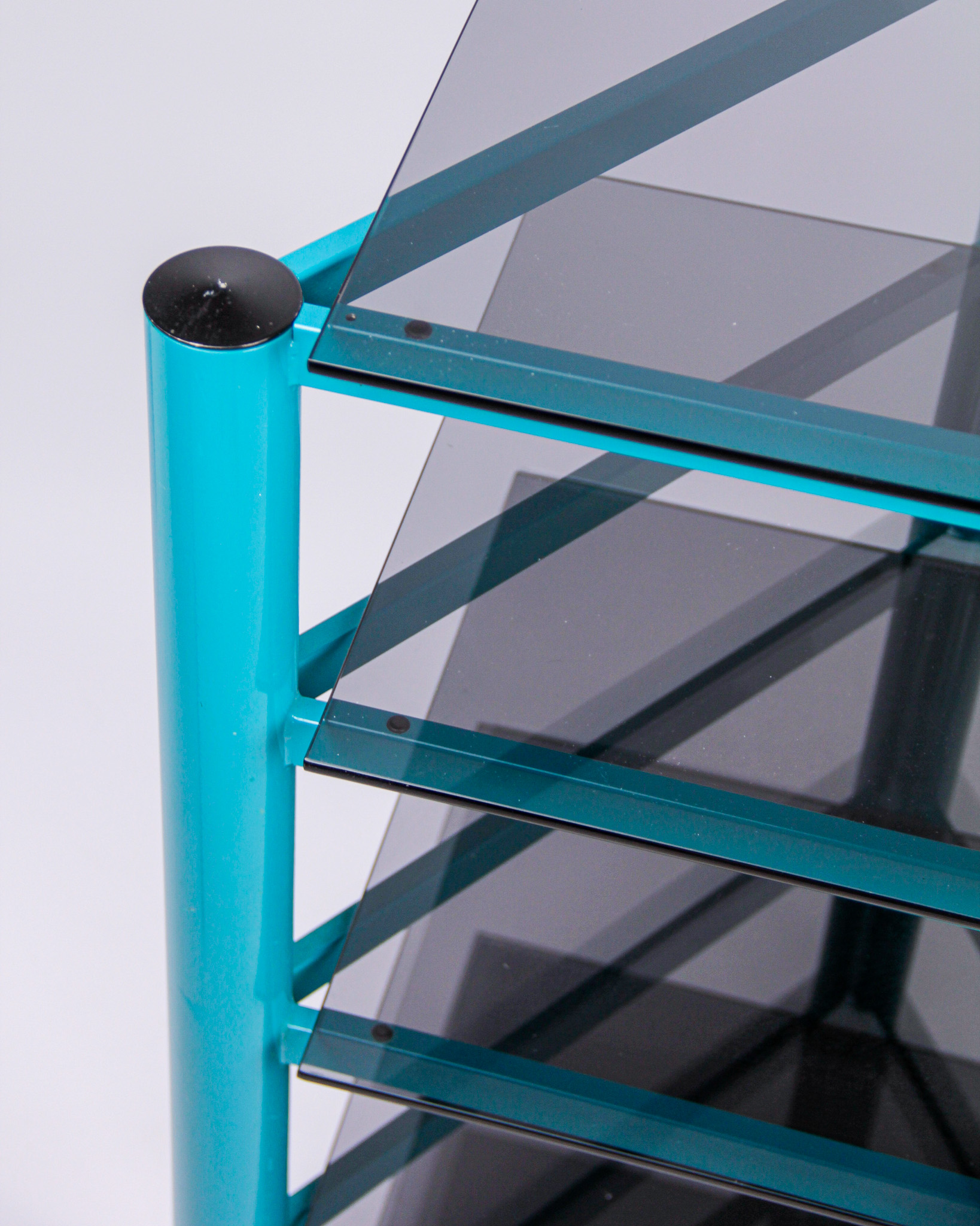 Mediahylla, turkos lackerad metall och tonat glas, Soundstyle, England