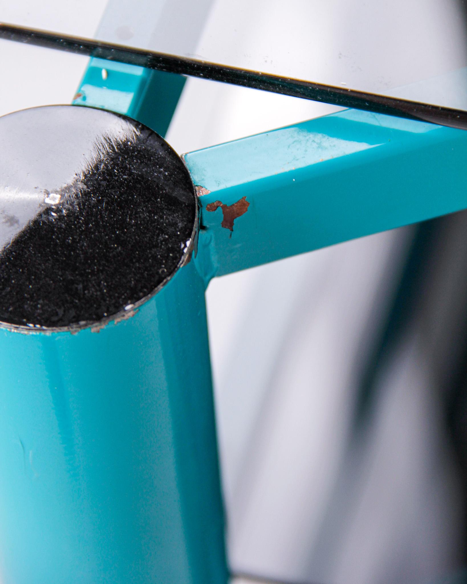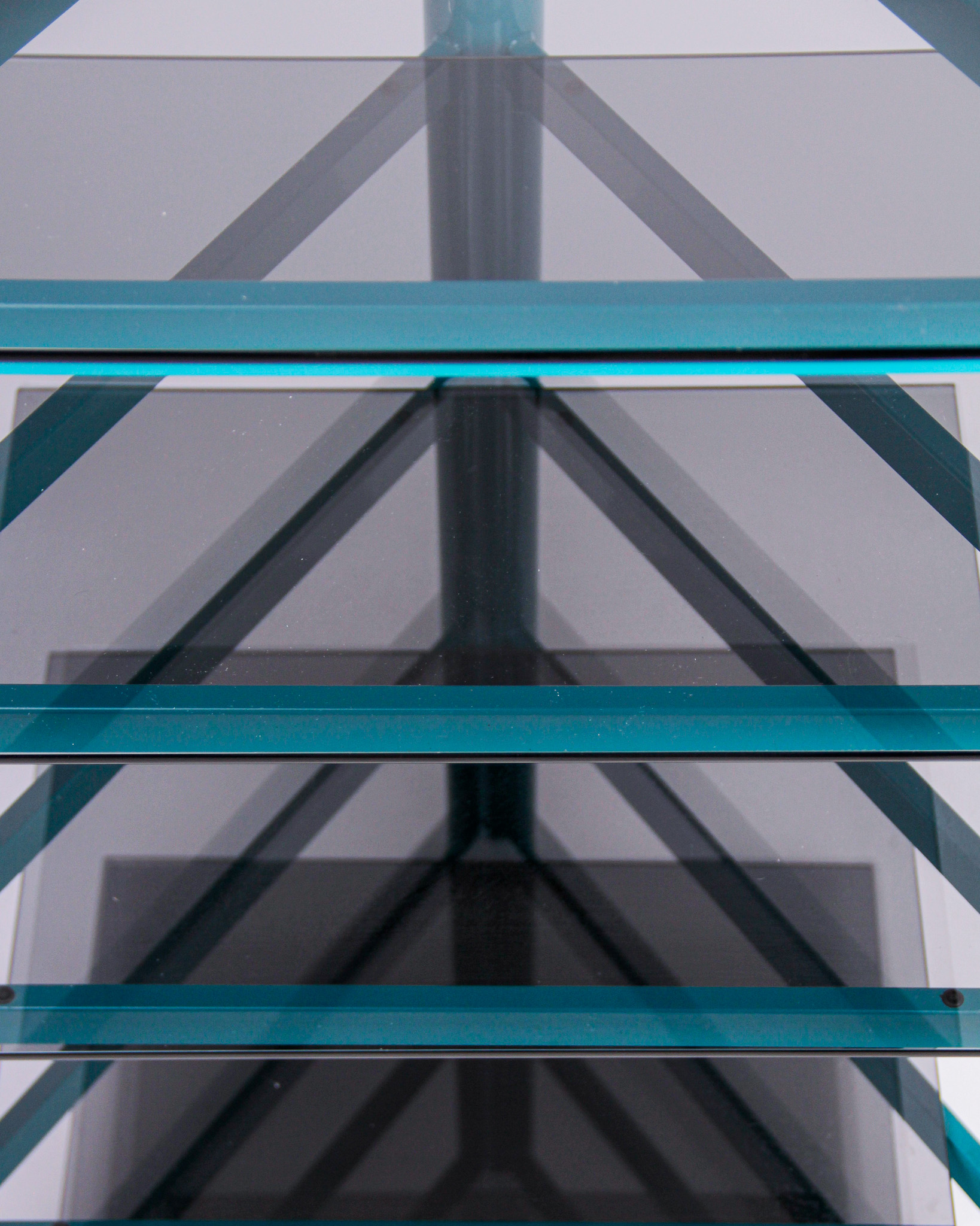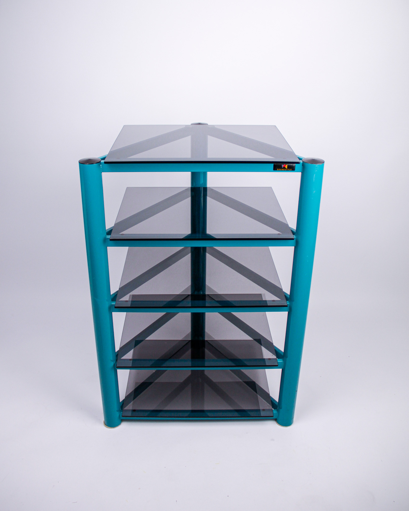 Mediahylla, turkos lackerad metall och tonat glas, Soundstyle, England