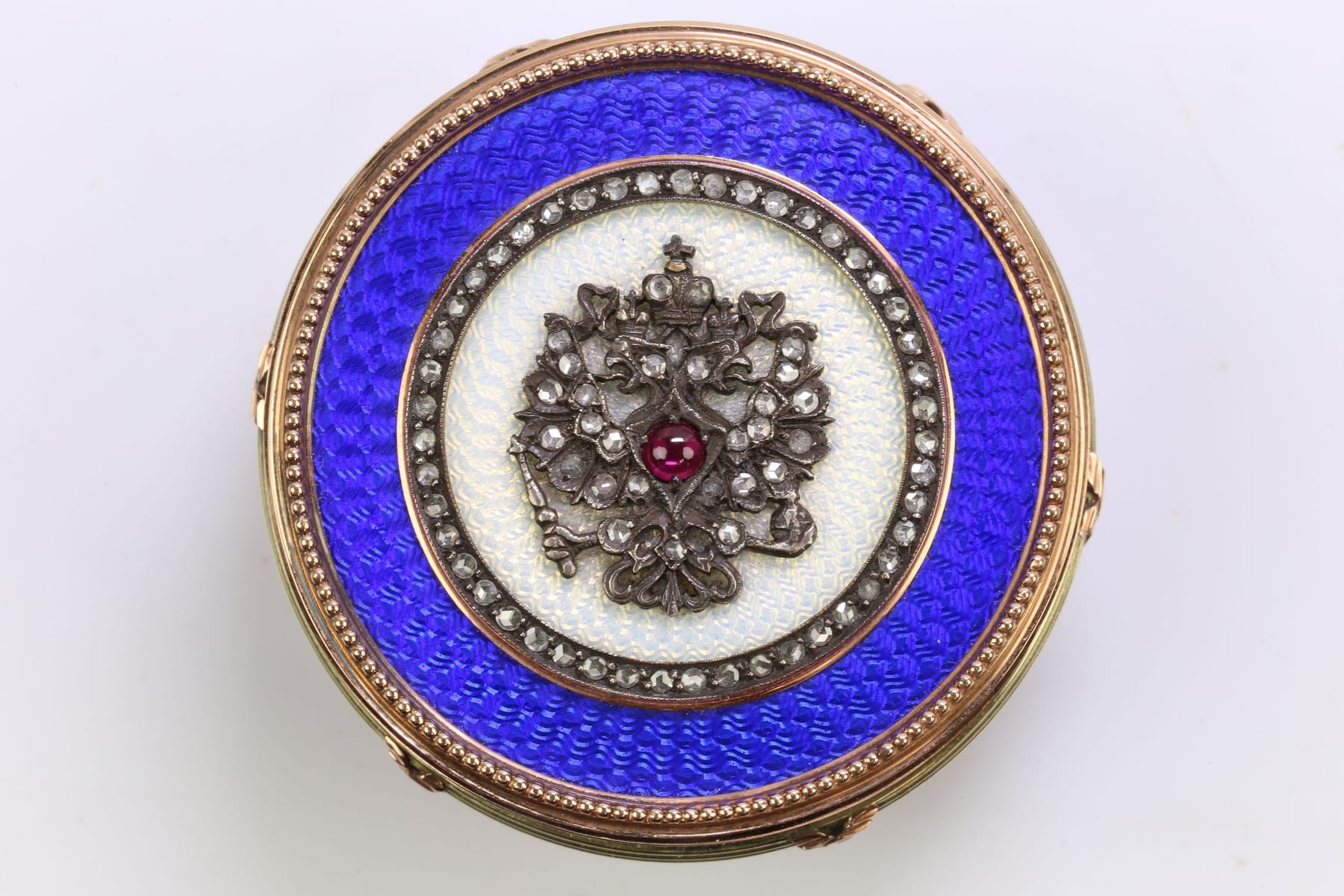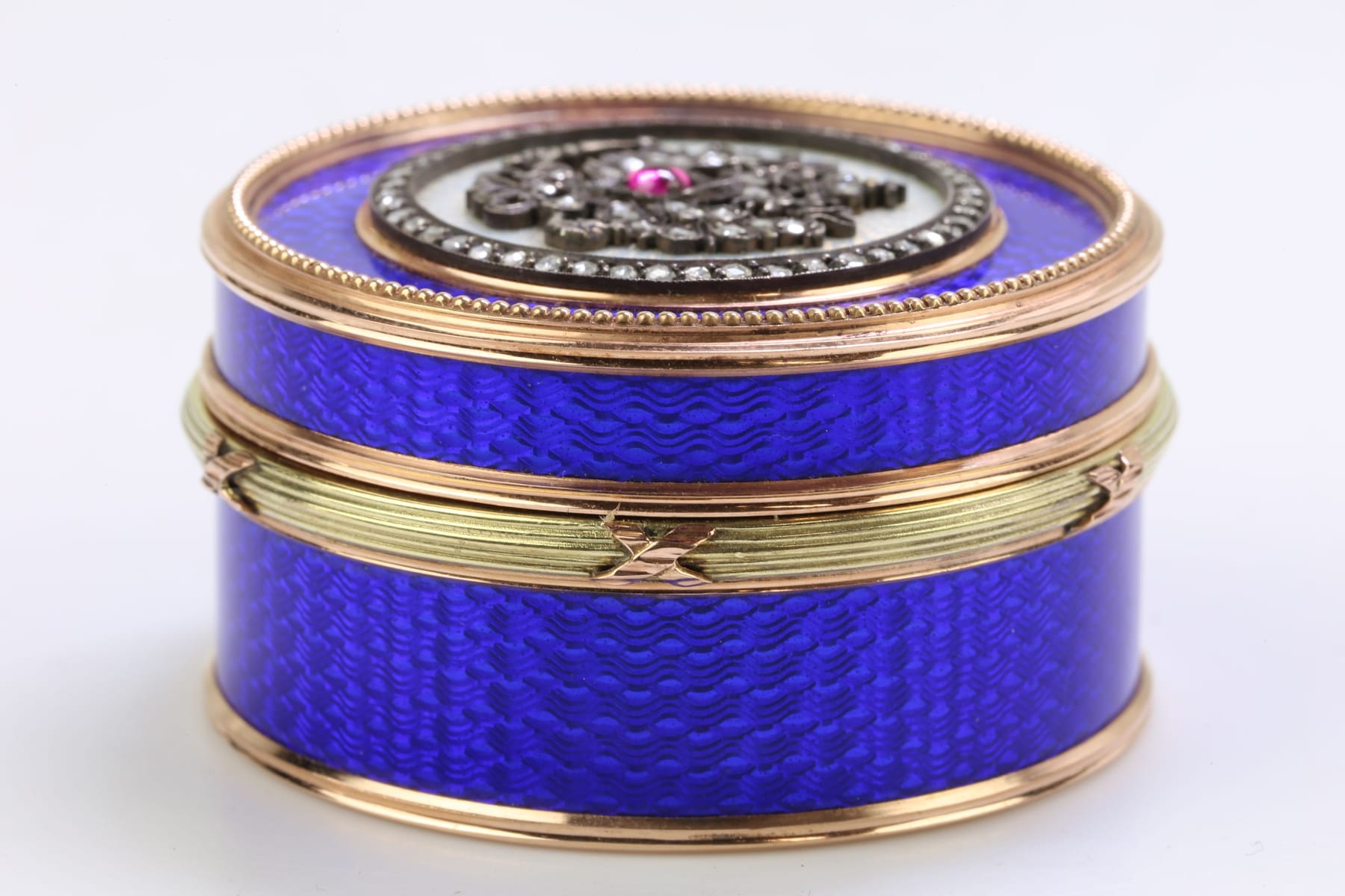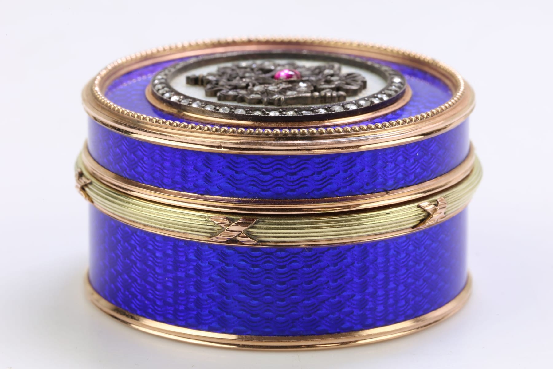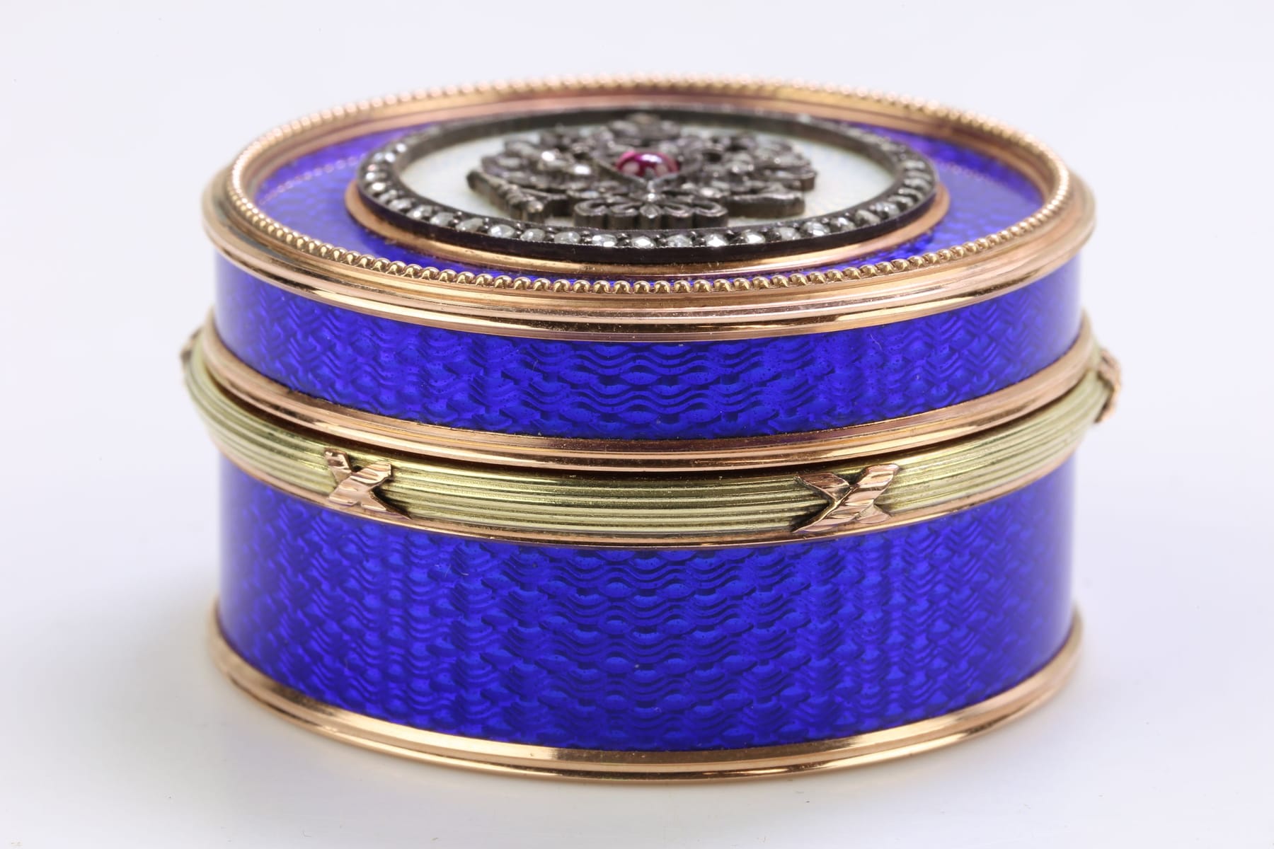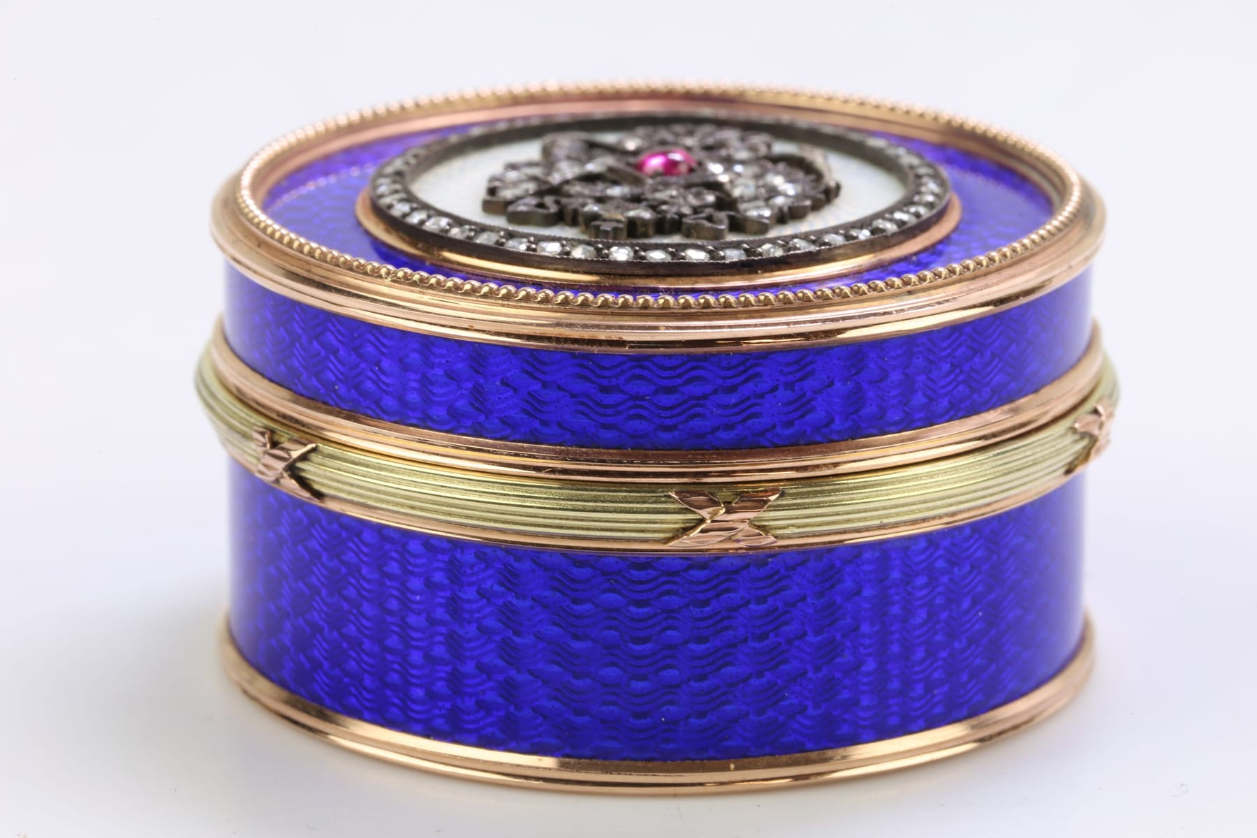DOSA, guld, 14 k, ca 107,3 g, dekor i blå emalj och silver, med diamanter, 86 st