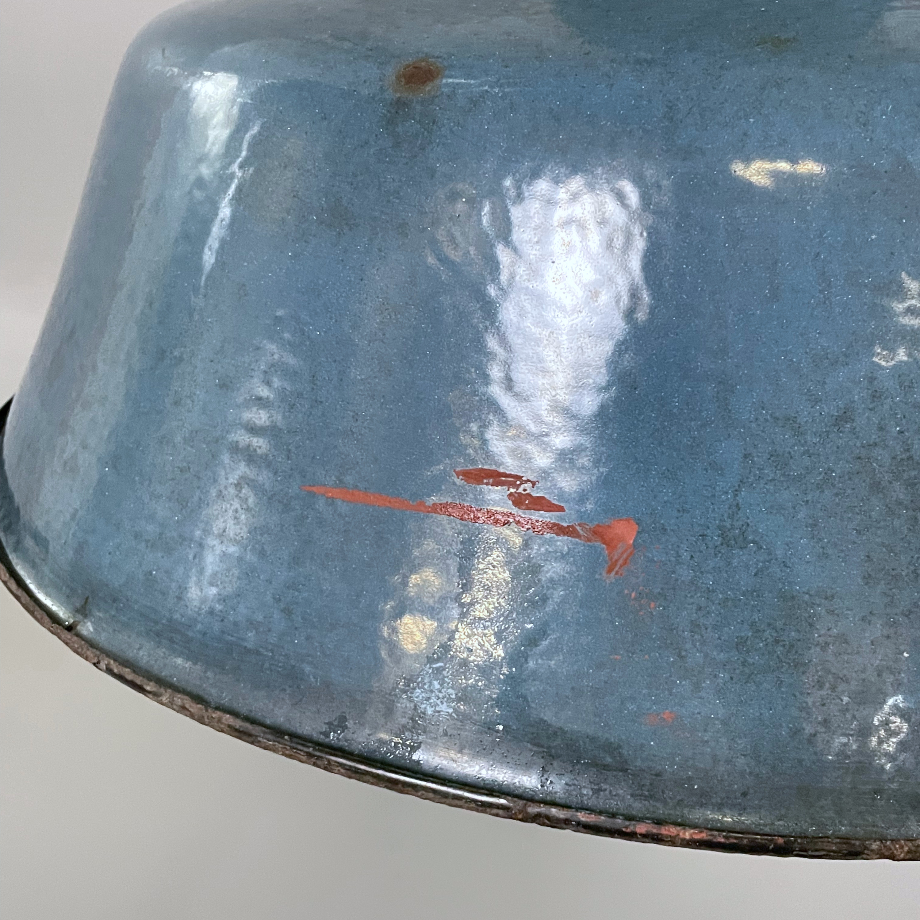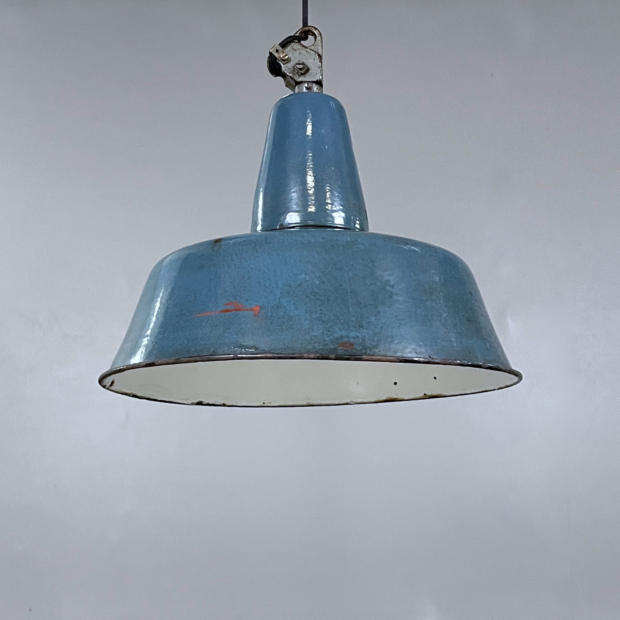 Industriell fabrikslampa i blå emalj med gjutjärnsdetaljer. Troligen tillverkad av Polam Wilkasy i Polen under 1960-talet, men detta är ej bekräftat. Lampan har industriell patina och synligt bruksslitage. Saknar stickkontakt.