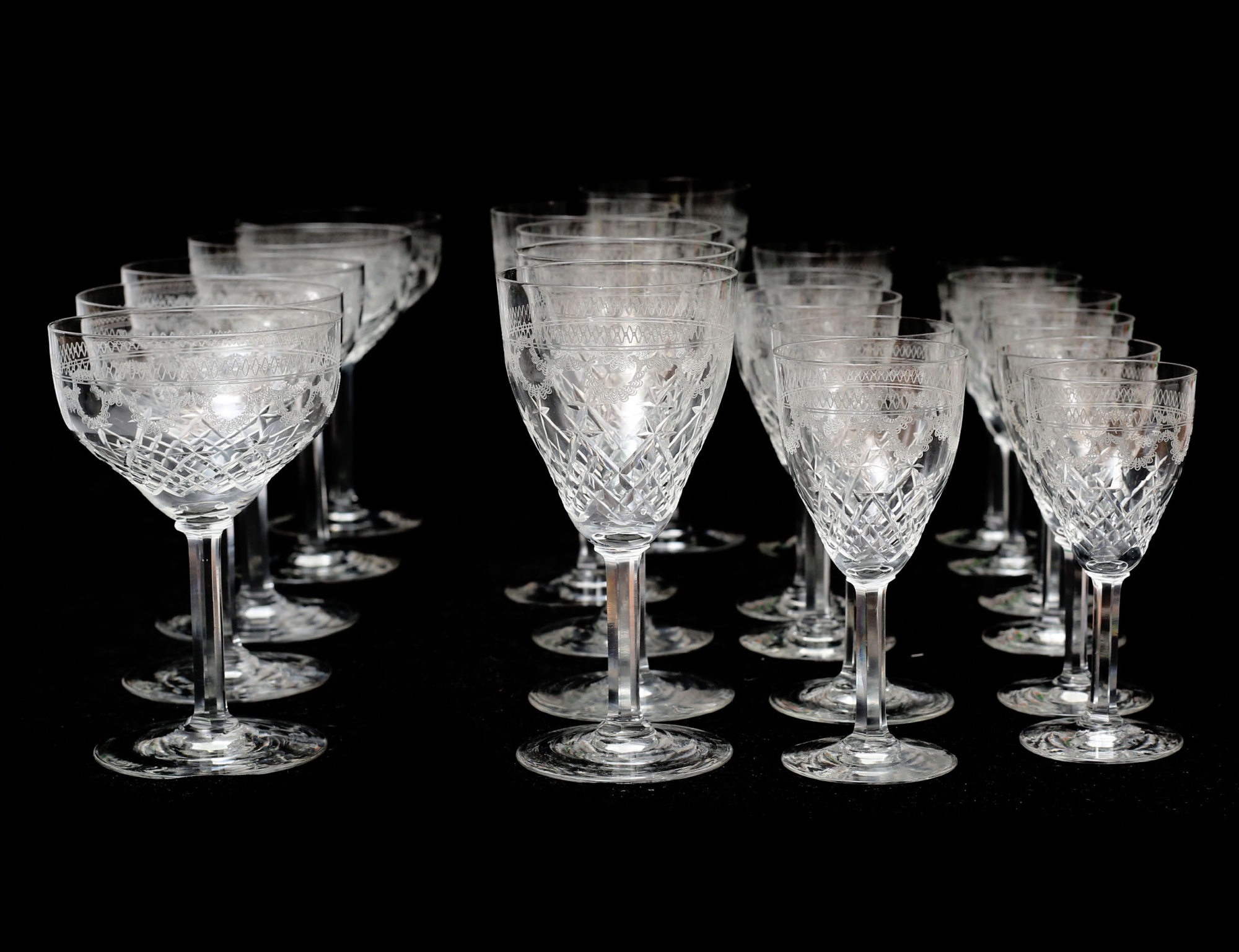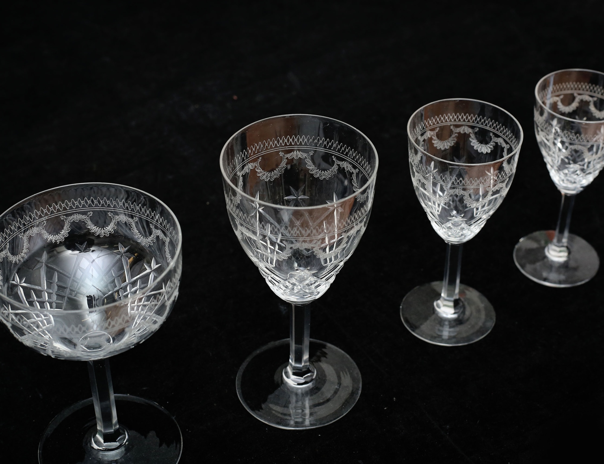 pantograferad och skärslipad dekor, 8 vinglas, 7 champagne, 18 portvin samt 12 likör, höjd 11-14 (ett champagne med micronagg på fotring)