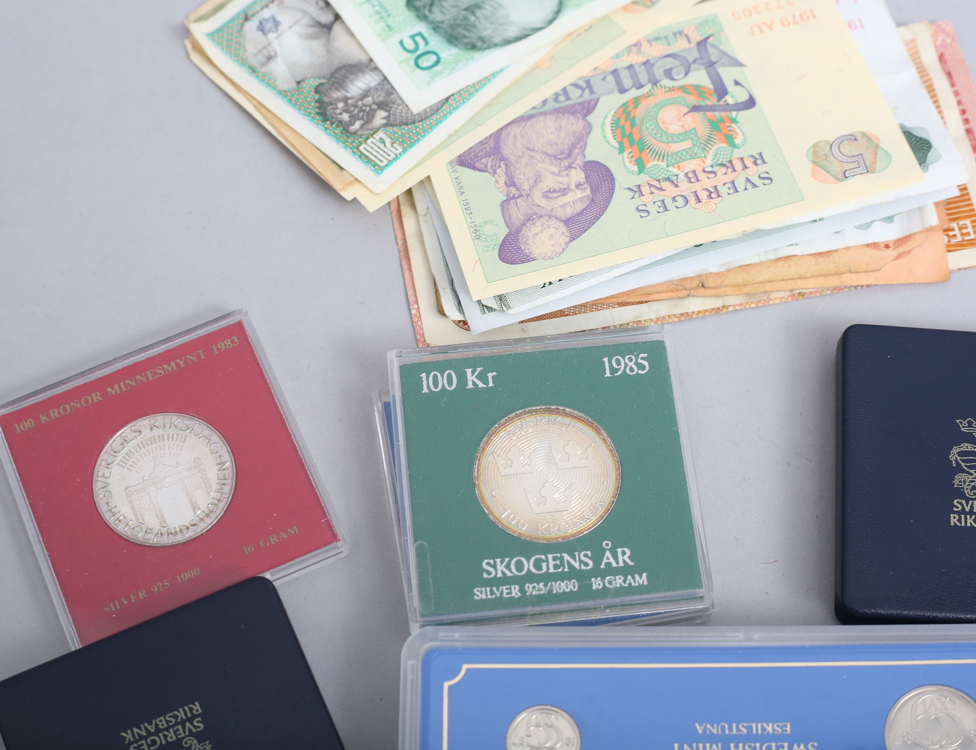925/1000 vikt 102 gram, diverse mynt och sedlar medföljer