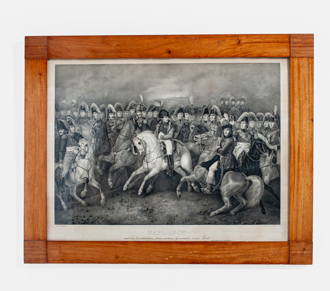 TRYCK, FÖRESTÄLLANDE Napoleon och hans generaler, 1800-tal, tillverkare Meisler. Medföljer en tavla med namn och placering på generalerna.