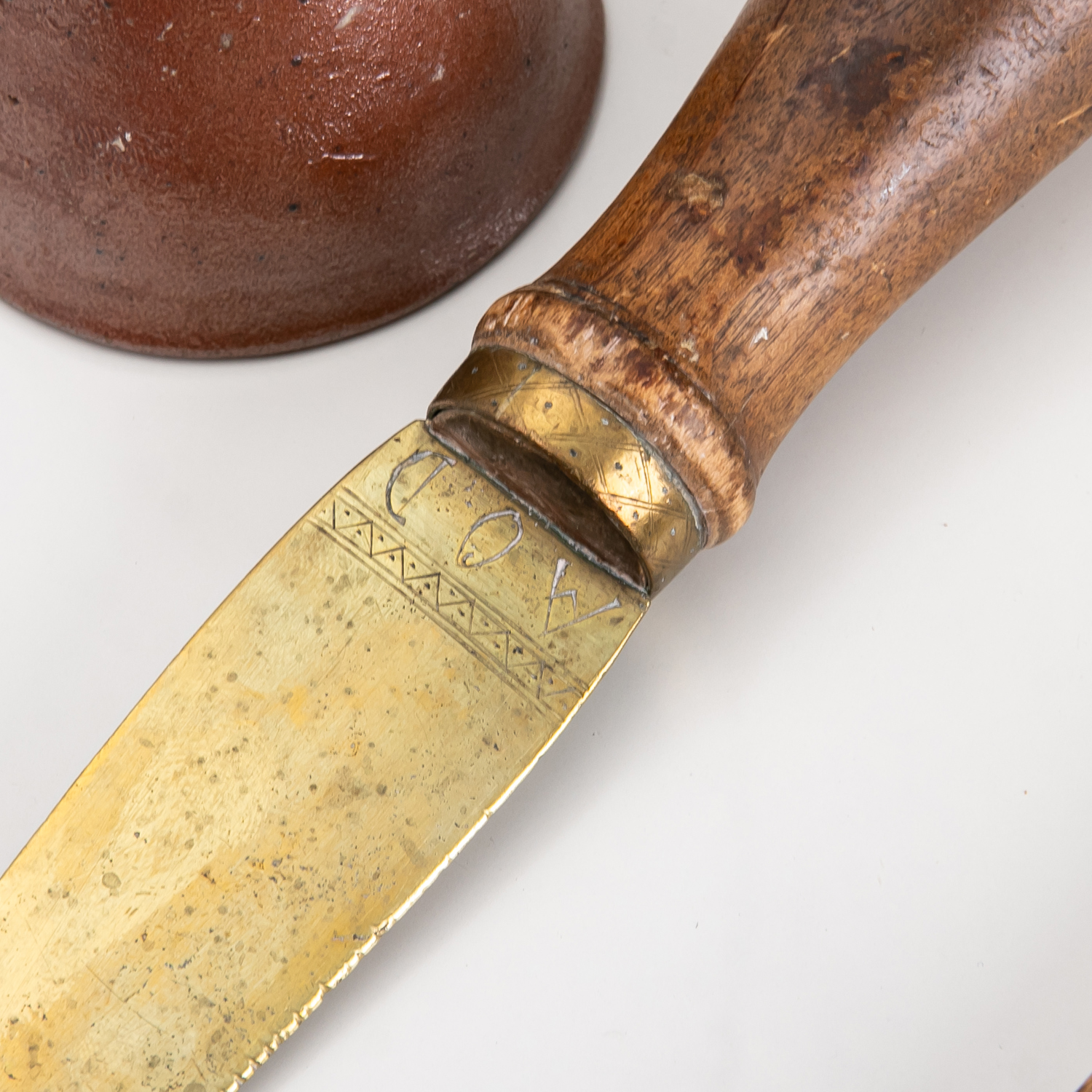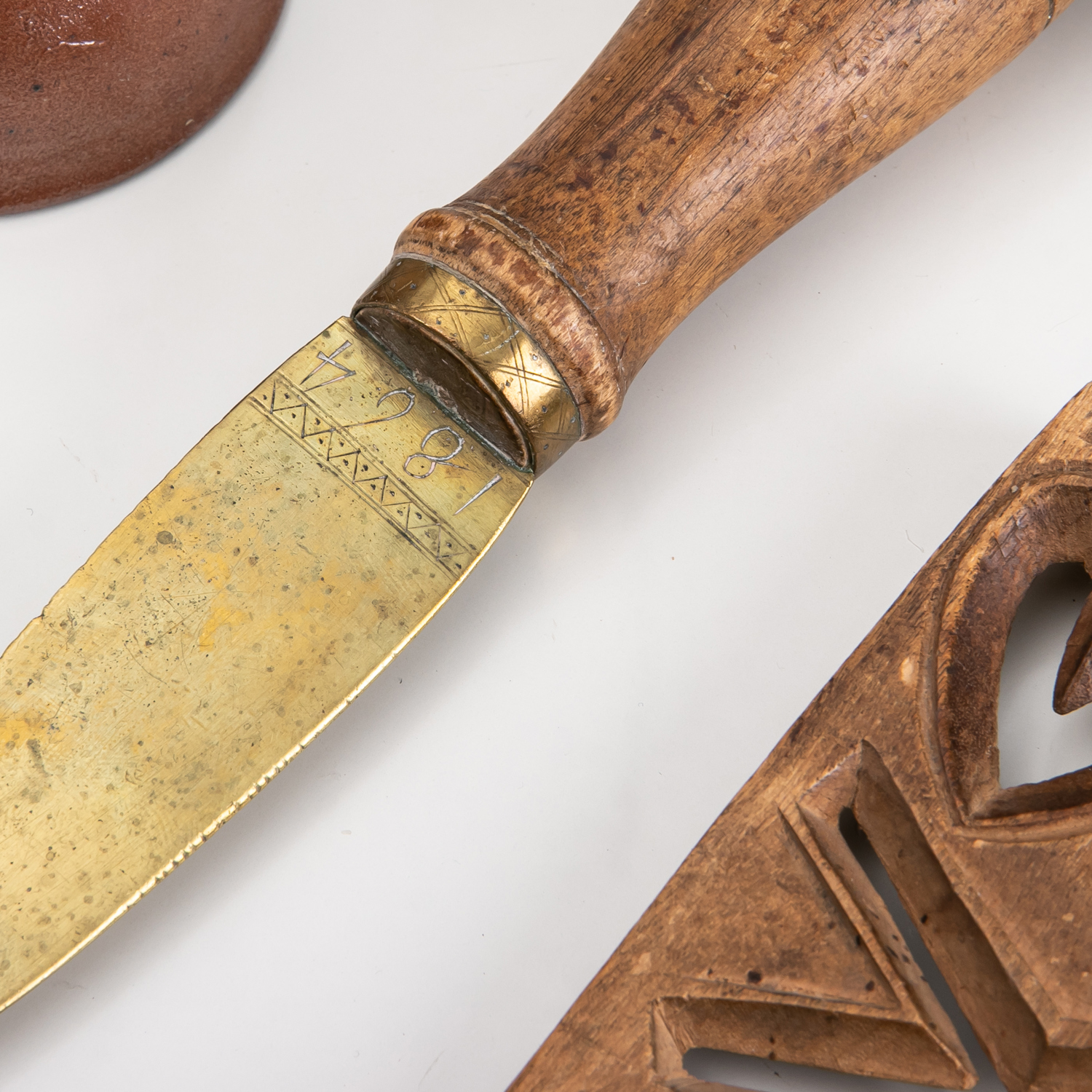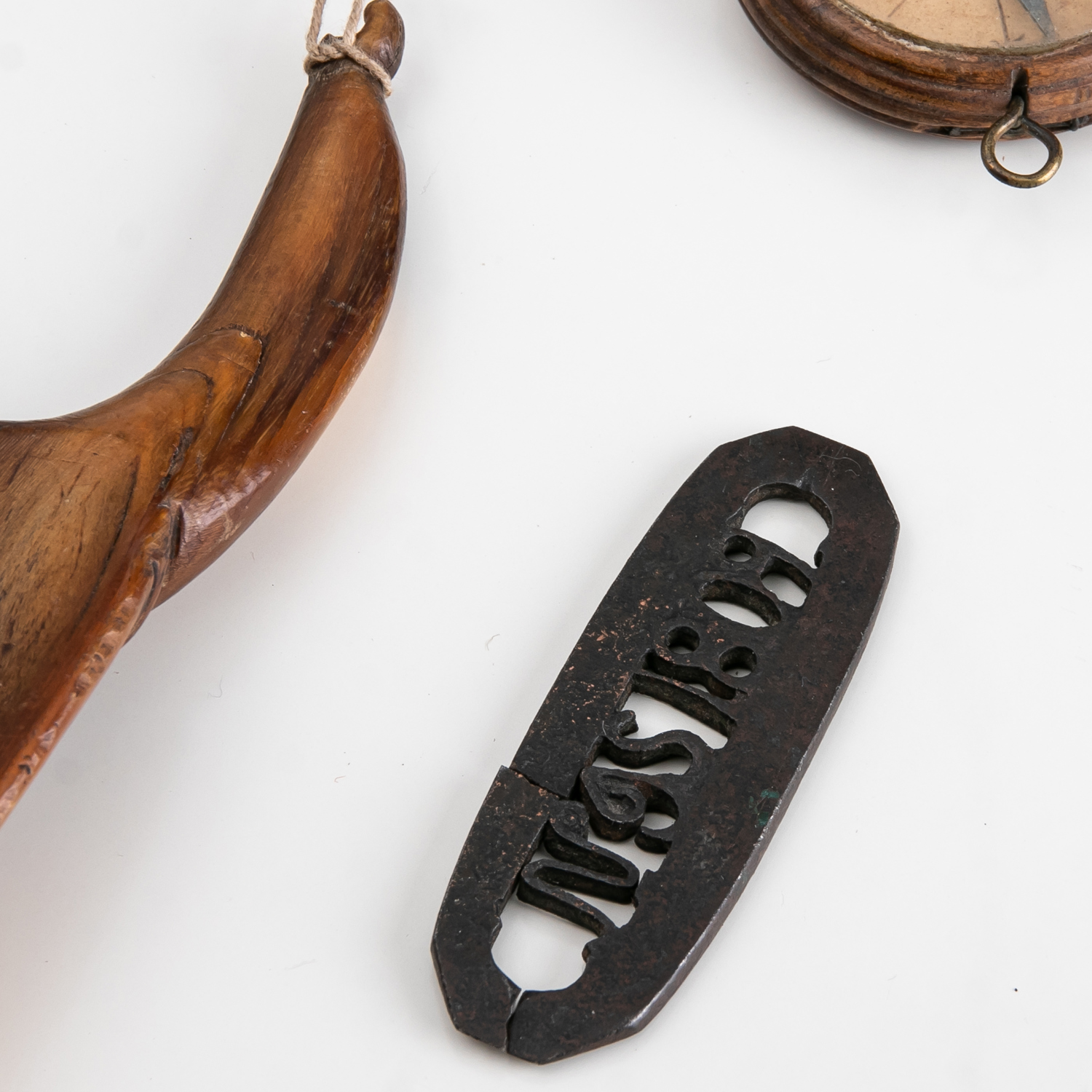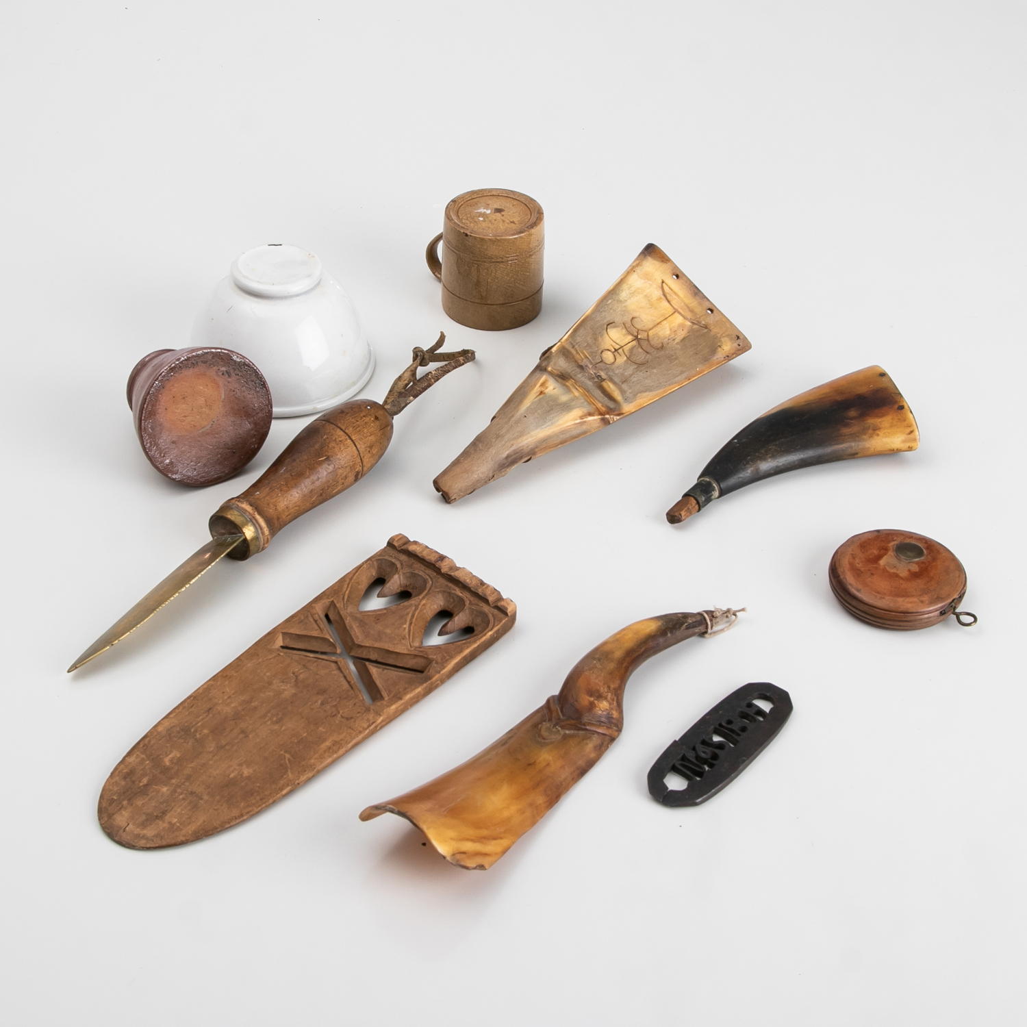 Kruthorn 2 st, bandverktyg, brännjärn, kompass, mugg, skohorn, keramikform, mässingskniv daterad och signerad och keramikställ.