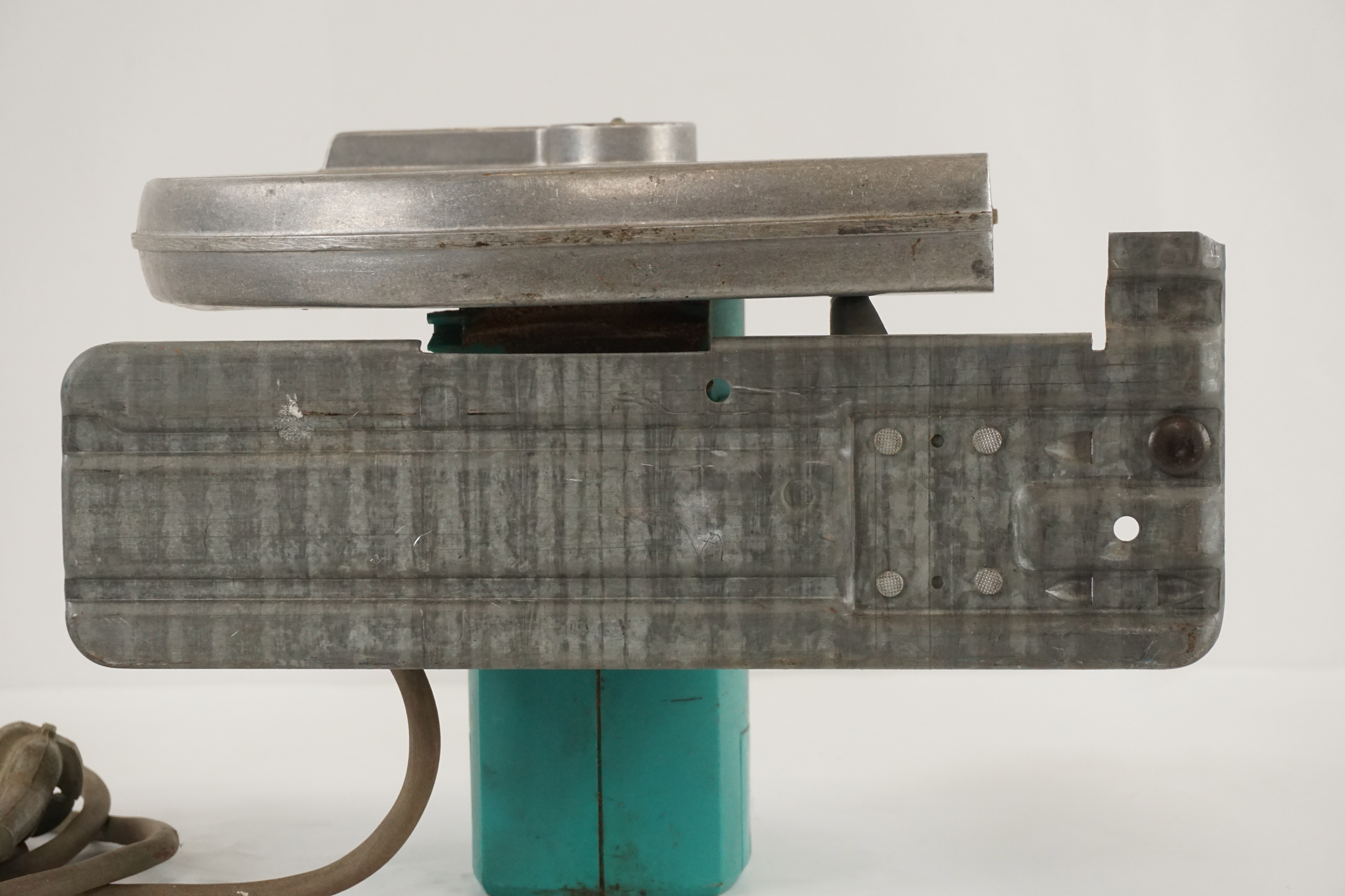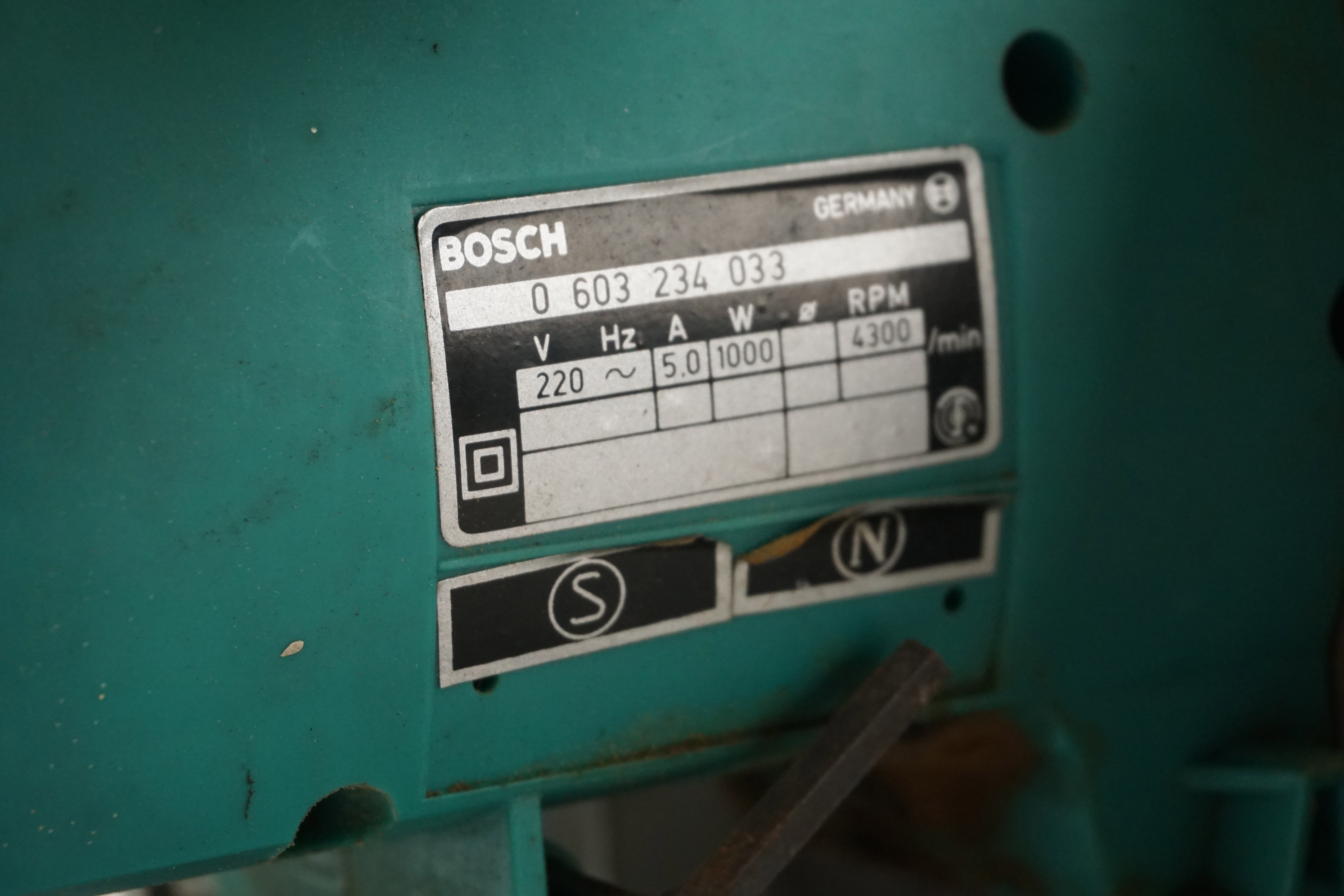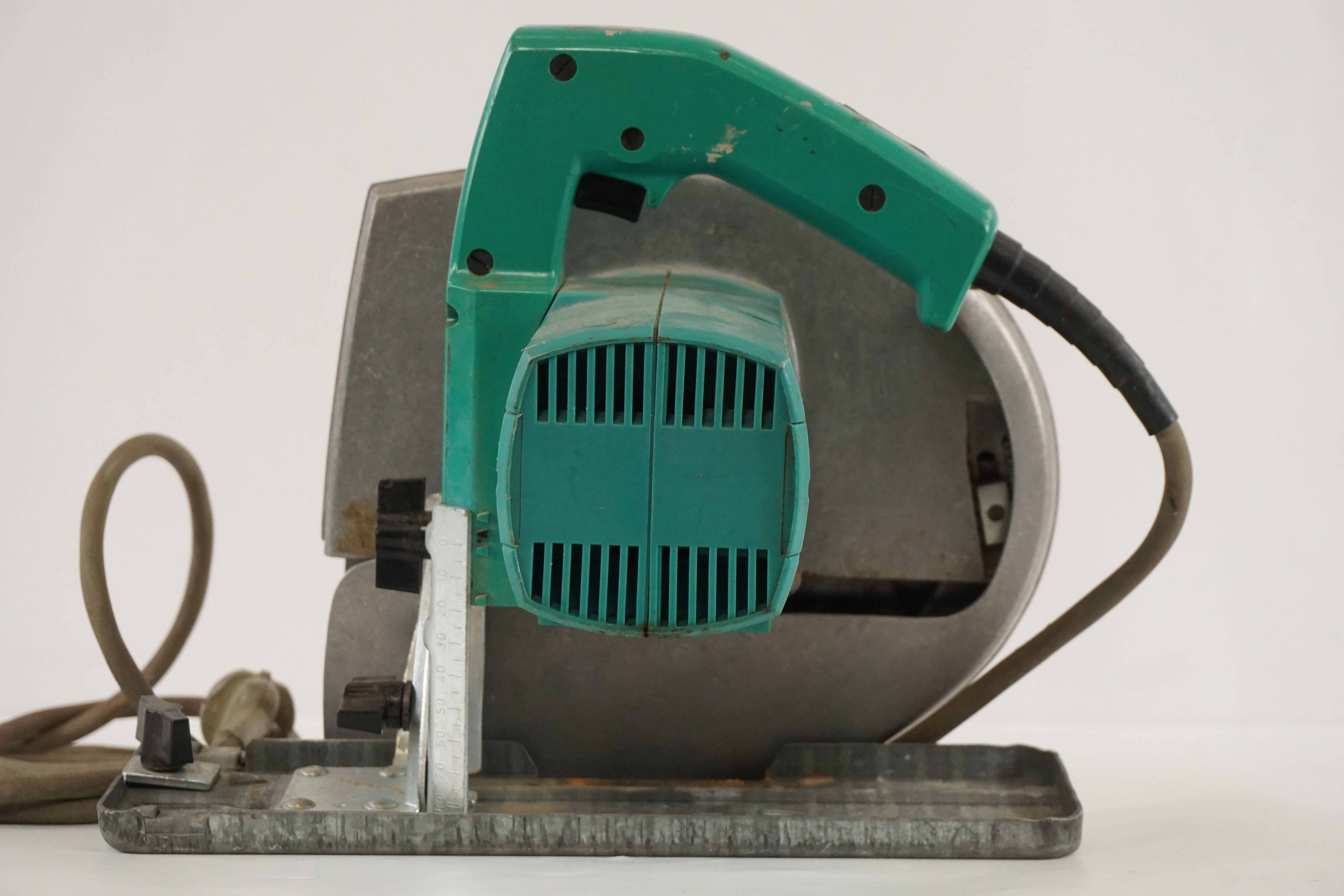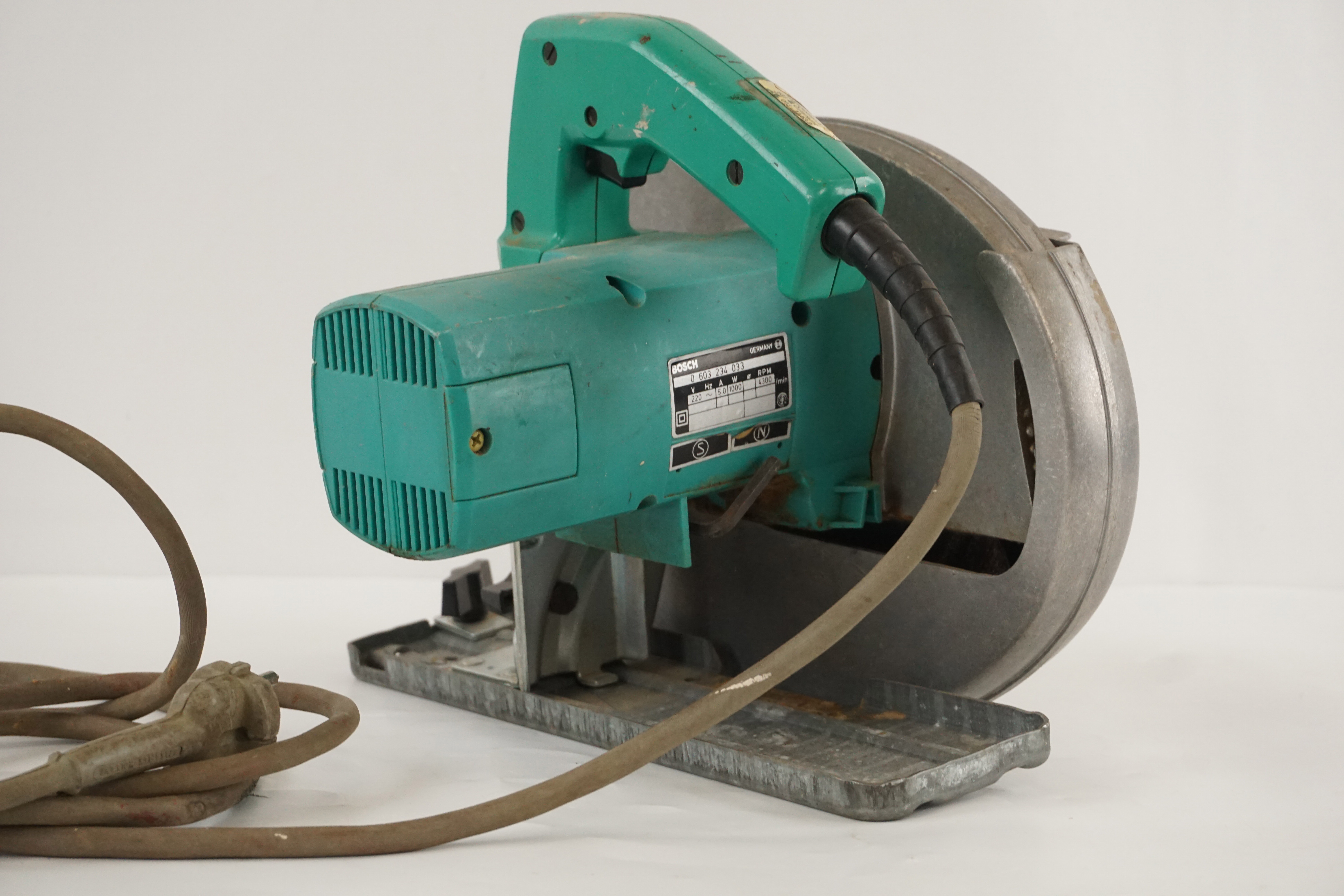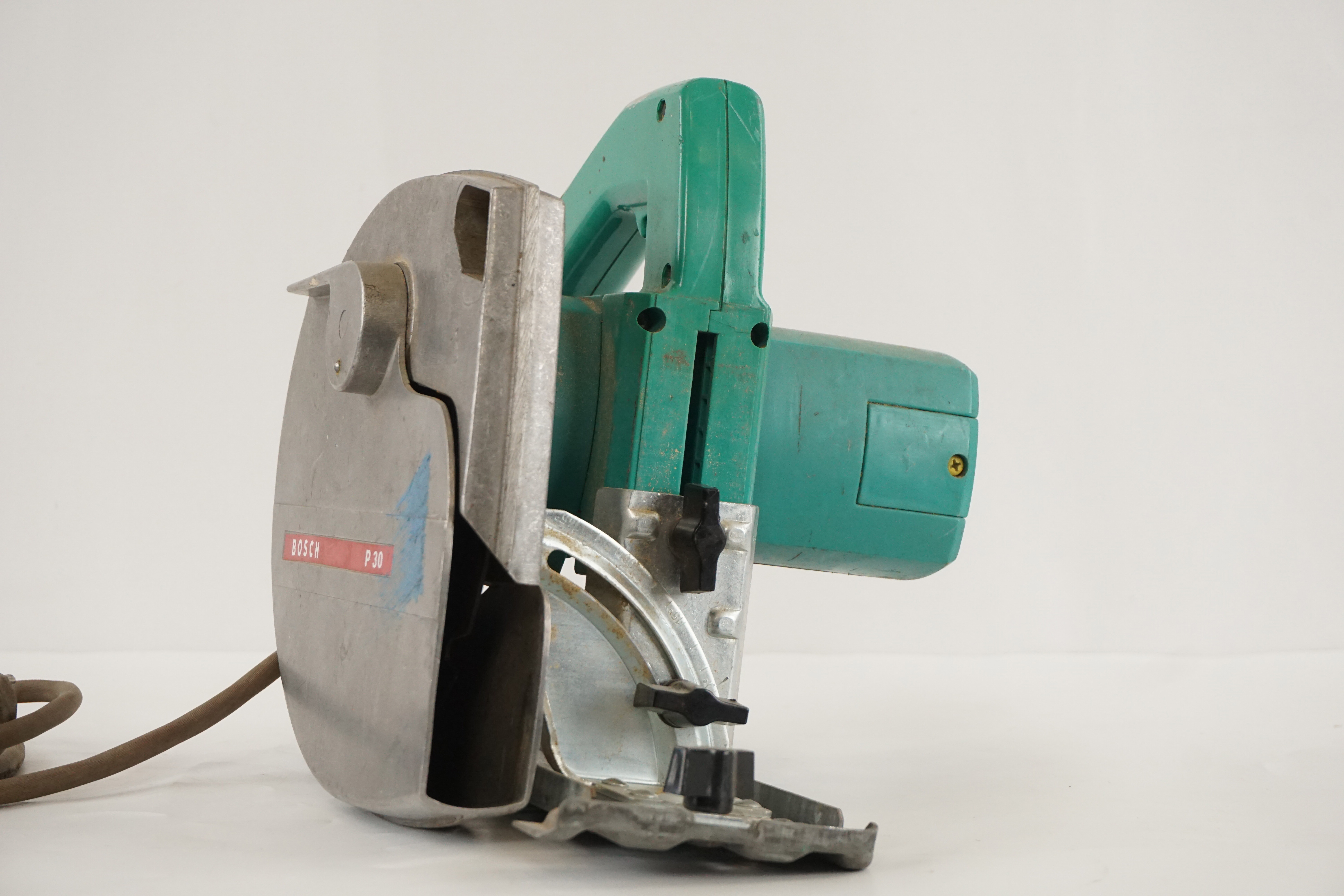 Robust elektrisk cirkelsåg från BOSCH, modell P30, med metallkropp och grönt plasthandtag. Det är en vintage-modell som är mycket uppskattad för sin hållbara konstruktion och kraft, idealisk både för samlare av äldre verktyg och för den som söker ett pålitligt verktyg för tuffa arbeten.