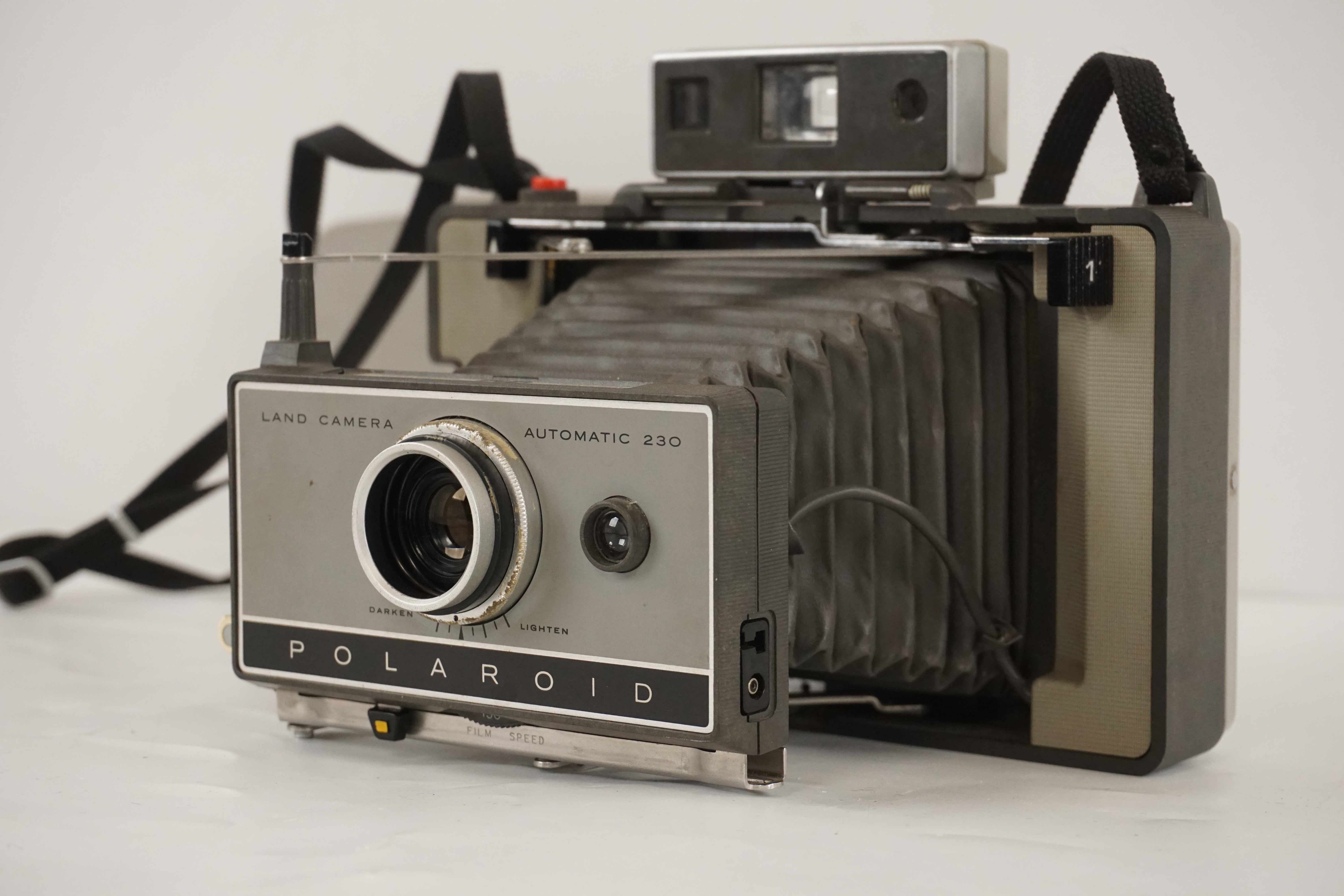 Klassisk Polaroidkamera från 1960-talet. Modellen är "Land Camera Automatic 230" och levereras med sin originala plastväska märkt "Polaroid 230". Kameran har en bälgkonstruktion och inbyggd ljusmätare. Perfekt för samlare eller retroentusiaster. Skick enligt bild.