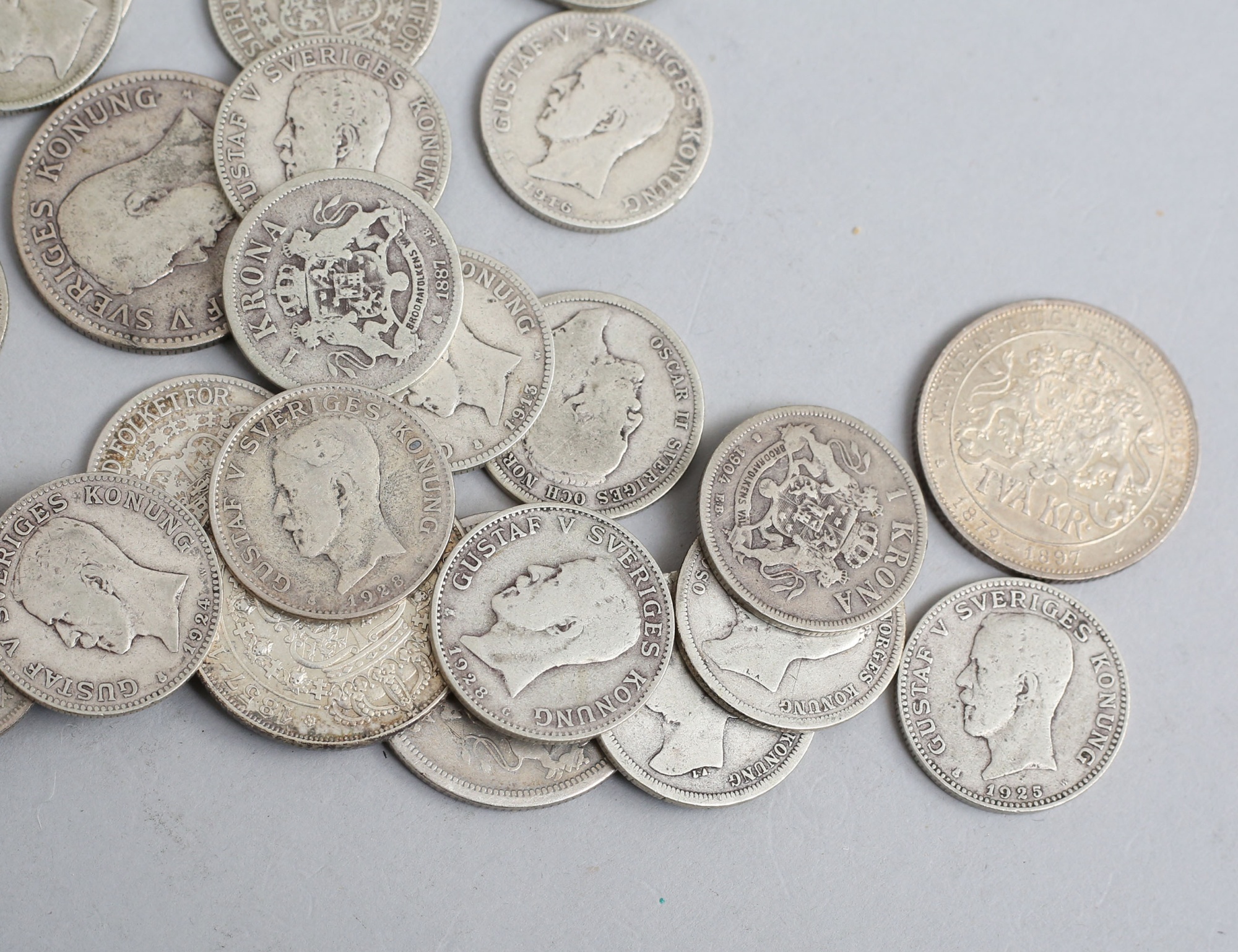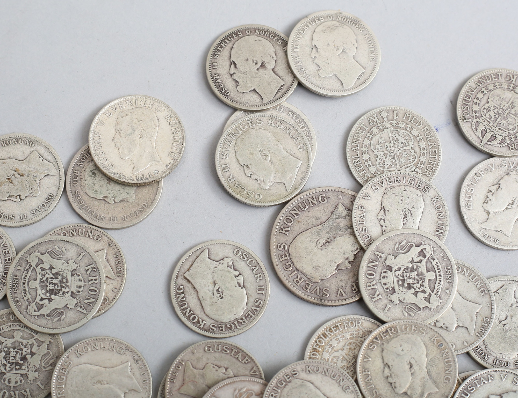 en och två kronor 800/1000, Oscar II och Gustav V före 1942, samt jubileum, vikt ca. 360 gram
