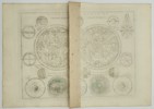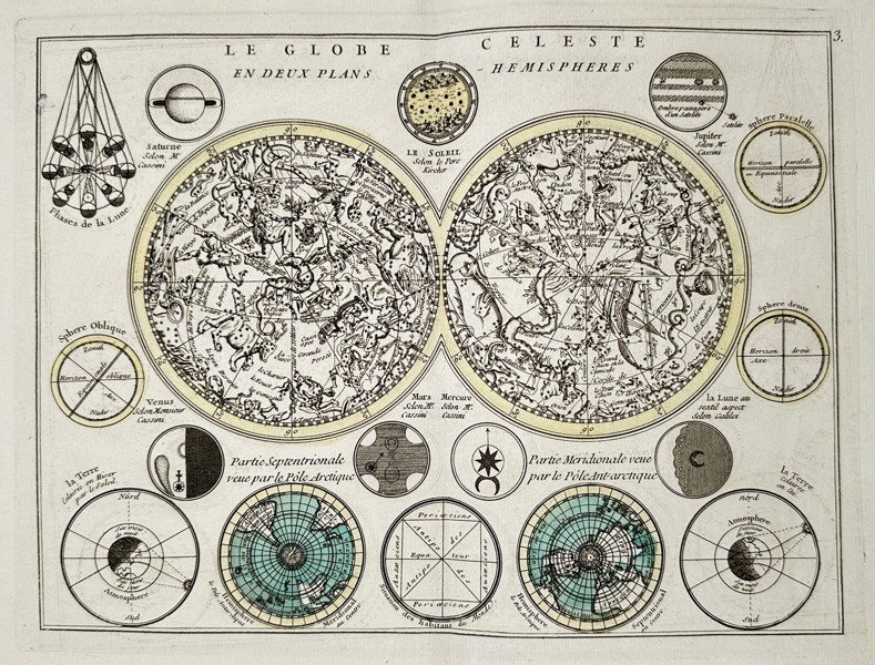 This engraving is a highly detailed astronomical and geographical diagram illustrating the celestial sphere divided into two hemispheres. The central composition features two large circular planispheres, representing the Celestial Globe in Two Planes (Le Globe en Deux Plans), which map out the constellations of the Northern and Southern Celestial Hemispheres. The surrounding margins are filled with smaller, instructional diagrams and circular maps that explain concepts such as the Oblique Sphere (Sphere oblique), the Parallel Sphere (Sphere parallèle), and the polar projections of the Earth. The use of hand-colouring highlights the landmasses and certain celestial bodies.