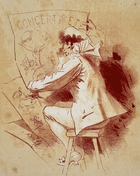 This print is a unique design, featuring an artist at work on a poster for "Concert Yvette" (referencing the famous singer Yvette Guilbert), and was issued as a special supplement to the influential Art Nouveau portfolio Les Maîtres de l'Affiche (The Masters of the Poster). The image depicts a dynamic figure, a self-portrait of the artist, seated on a stool and rapidly sketching the core elements of the poster design onto a large sheet. The print is executed primarily in sanguine (red-brown) tones, giving it the appearance of a sketch or lithographic study. It was printed by the Imprimerie Chaix, as indicated in the margin, which published the entire collection of poster reproductions.