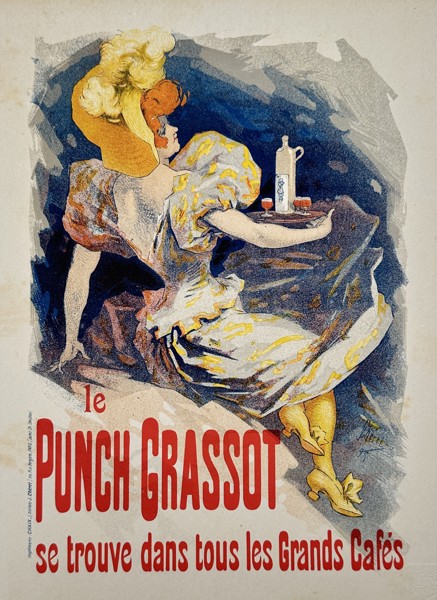 This colorful print is a miniature of one of Jules Chéret's celebrated commercial posters in the prestigious Les Maîtres de l'Affiche (The Masters of the Poster) series. The illustration advertises the beverage Punch Grassot, with the text reading: "Punch Grassot is available in all Great Cafés" (Le Punch Grassot se trouve dans tous les Grands Cafés). The central figure is a classic Chérette, a dynamic, red-haired young woman in motion, dressed in a swirling yellow and white dress, perched on a table and holding a tray with a bottle and a glass of the punch. The poster epitomizes the joyful, lively spirit of the Parisian Belle Époque and the new art of the street poster.