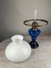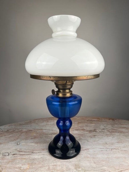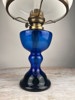 Fotogenlampa blå fot i glas, mässing, Kosmos brännare 1900talets första hälft