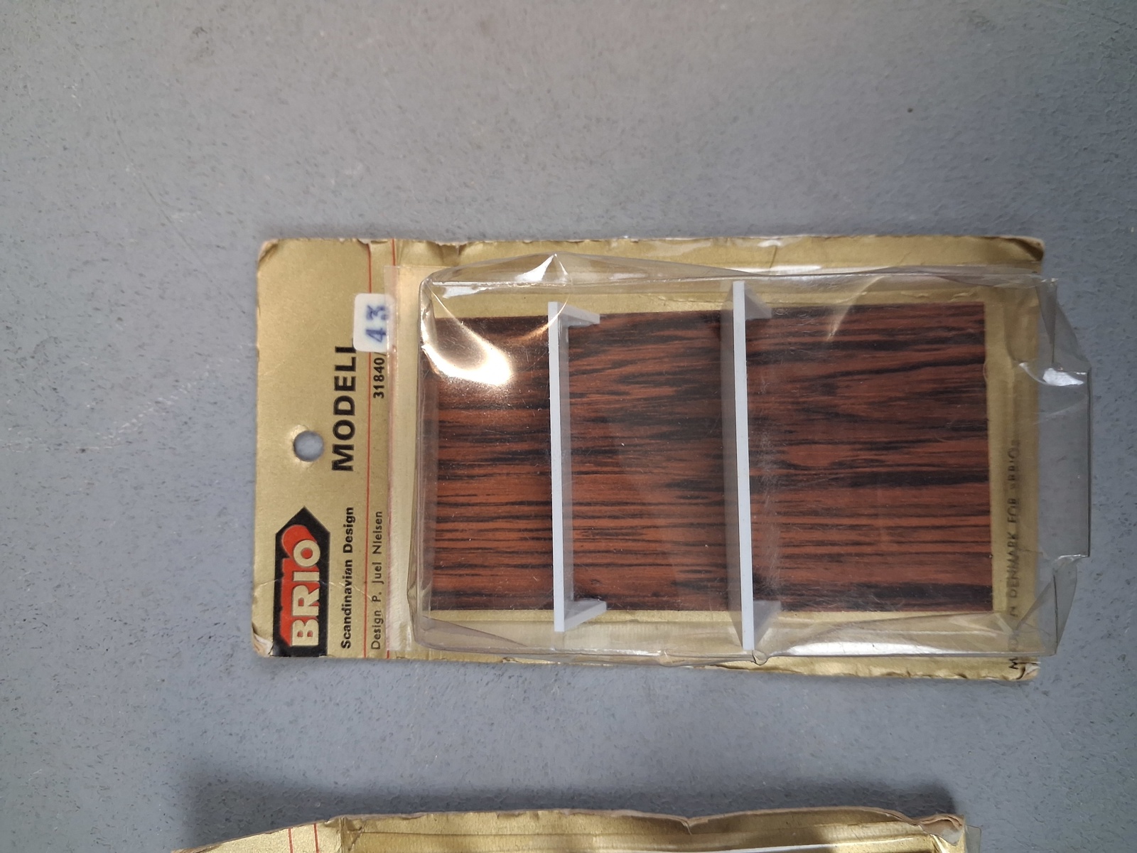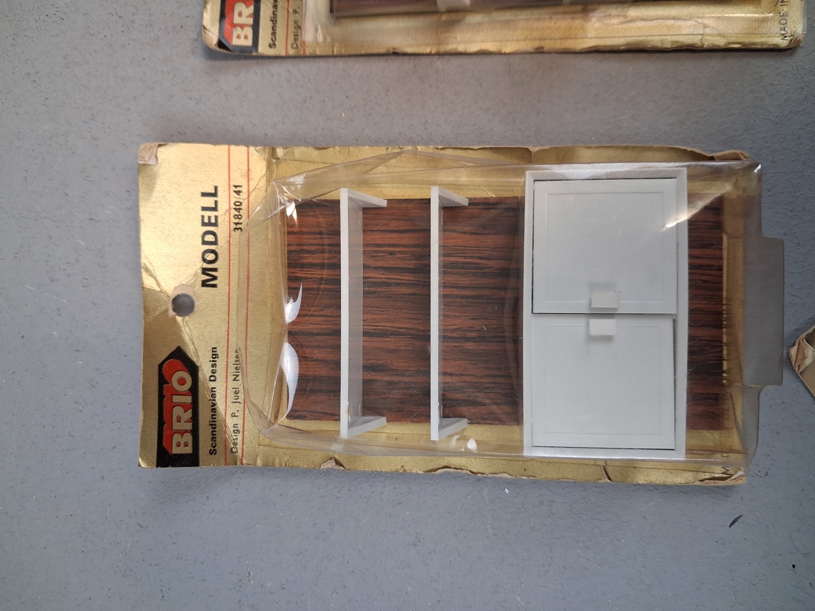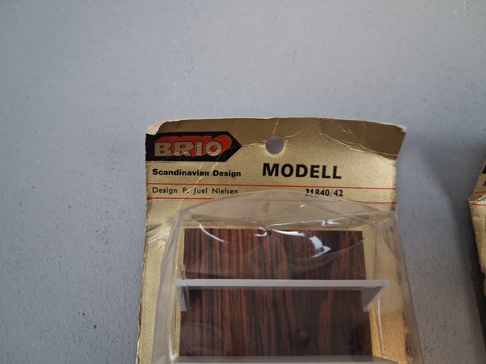 Bilder Dockhusmöbler. Brio Modell 31840/41, 31840,42, 31840/43 & 31846/44. Design P.Juel Nielsen, Originalförpackningar.