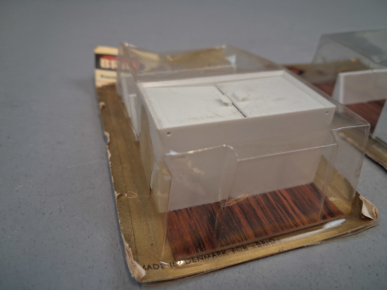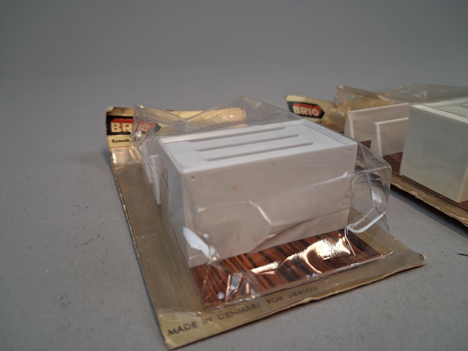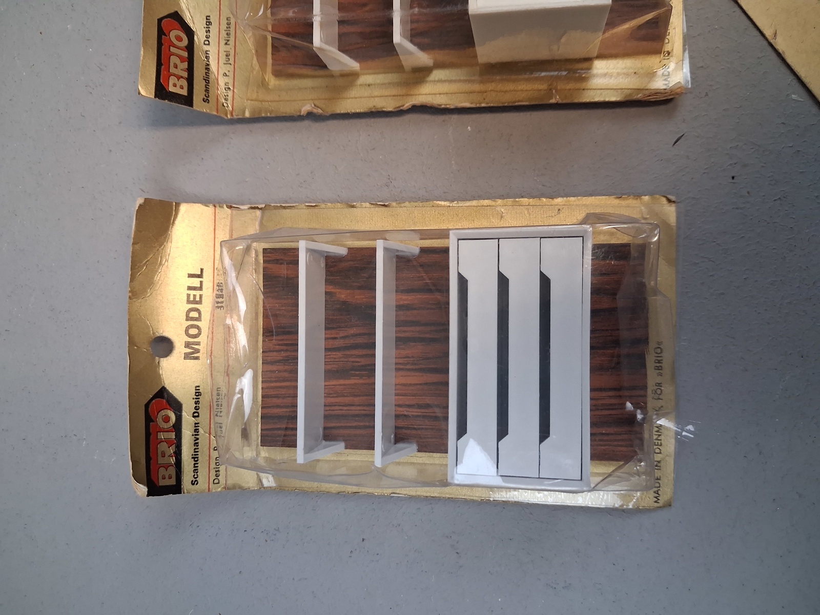 Bilder Dockhusmöbler. Brio Modell 31840/41, 31840,42, 31840/43 & 31846/44. Design P.Juel Nielsen, Originalförpackningar.