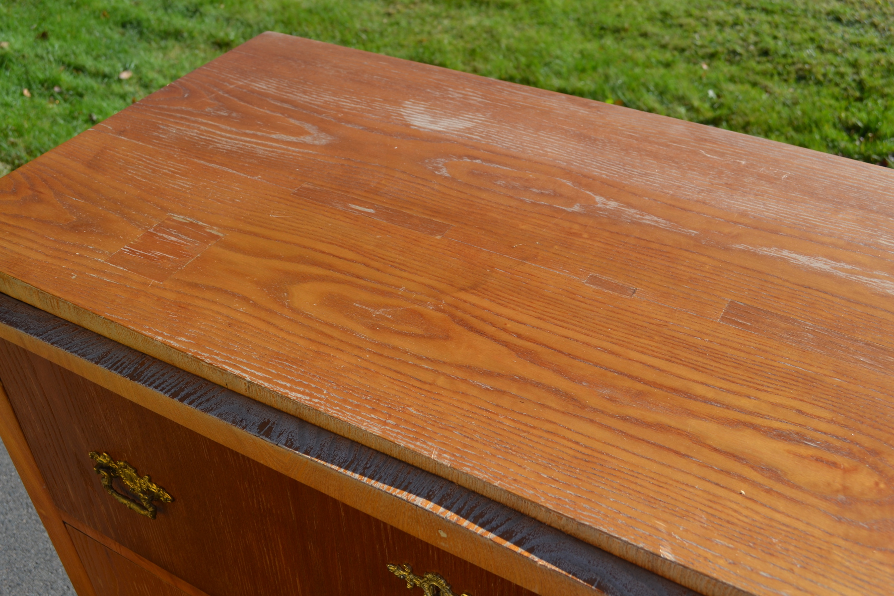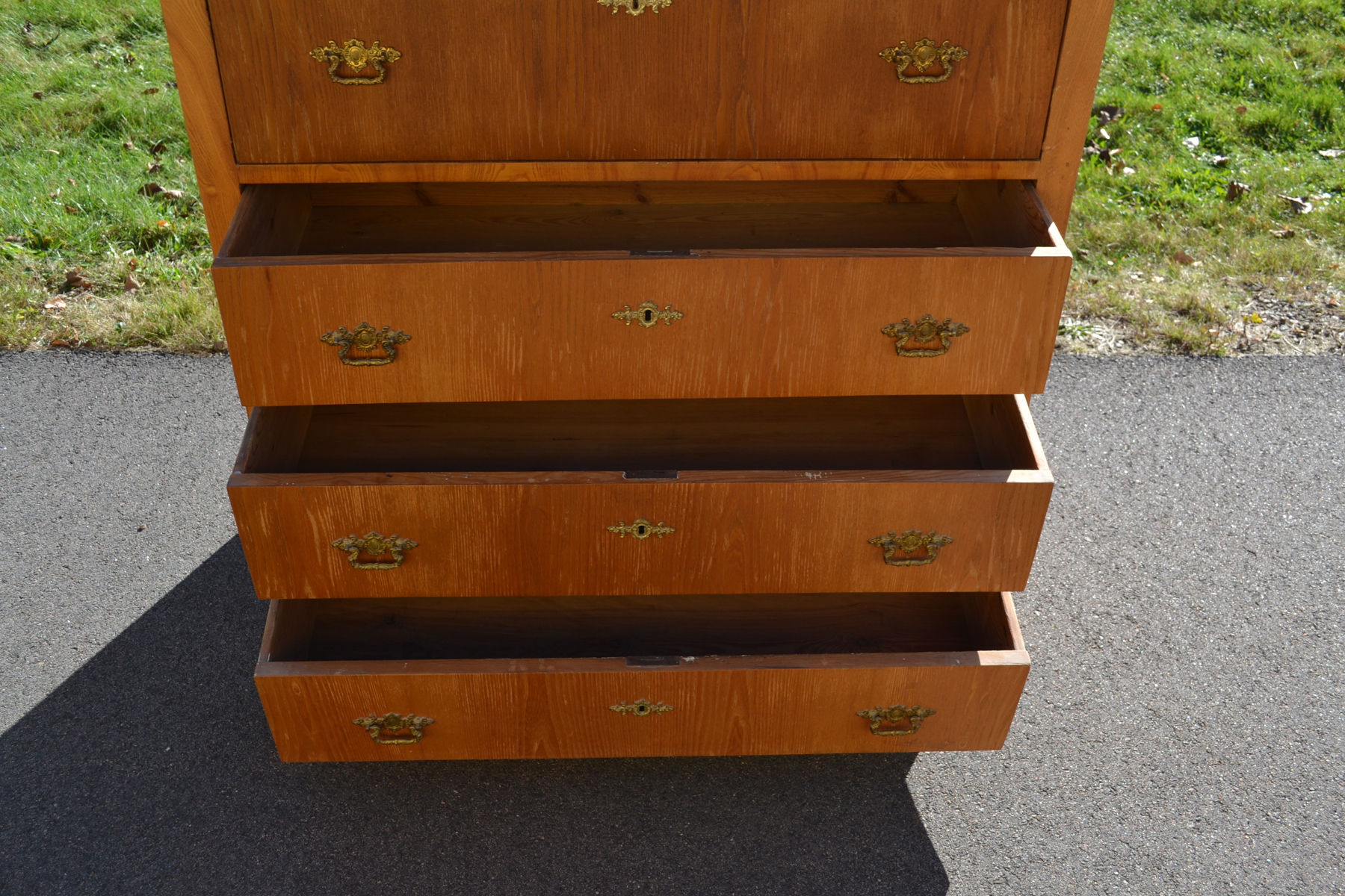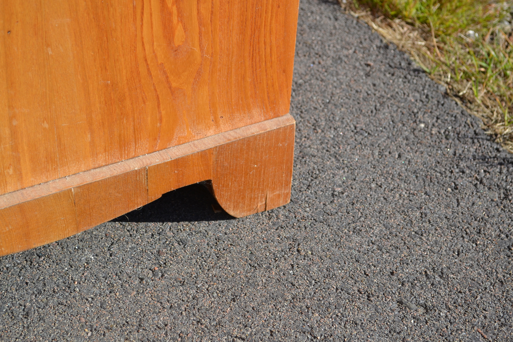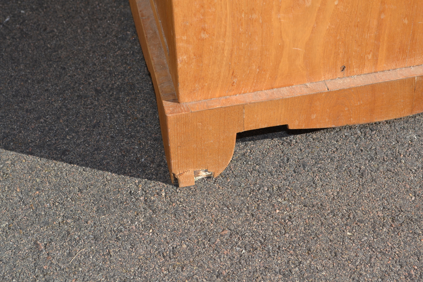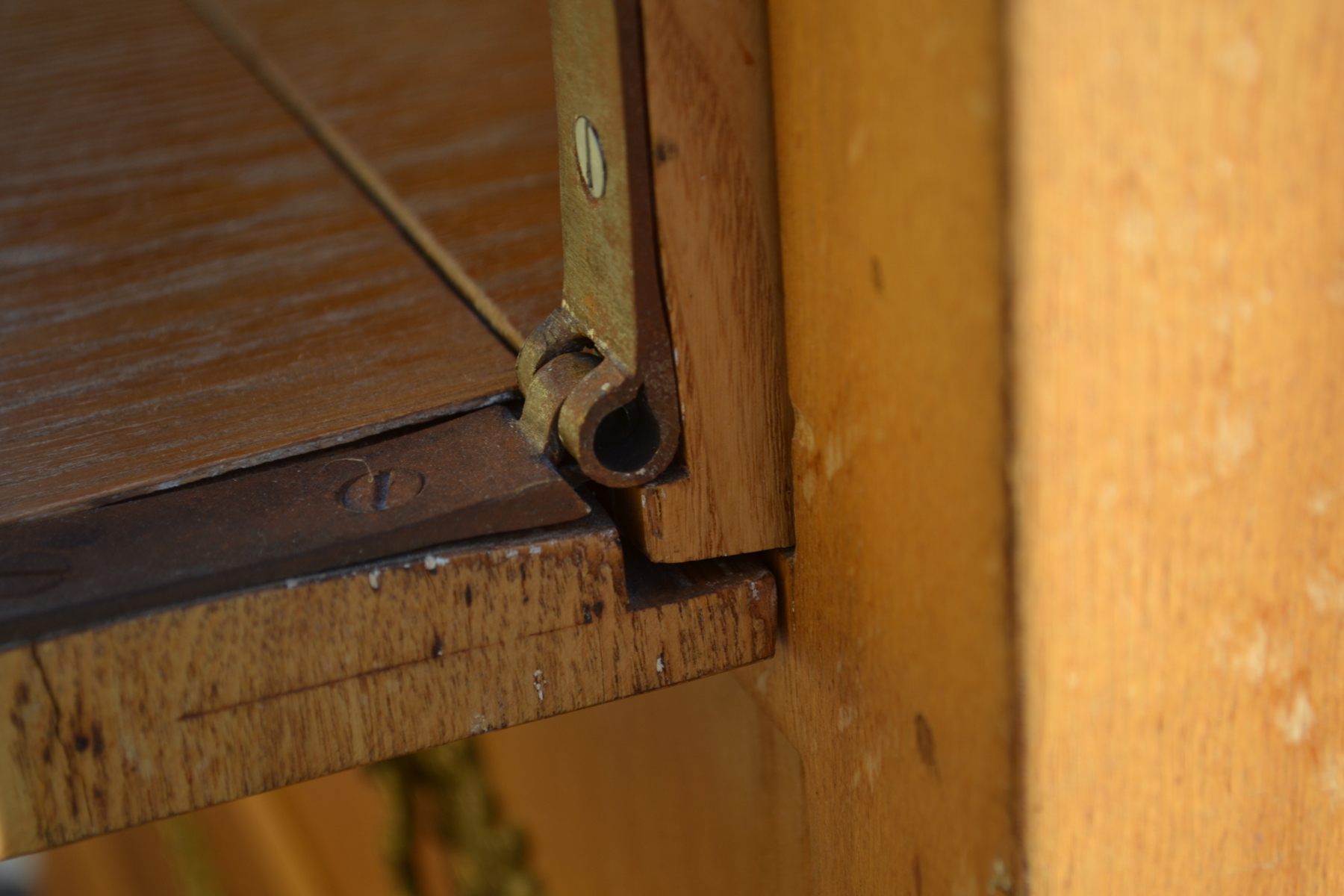 Ålderslitage, faneravslag, en knopp saknas på en innerlåda, en plugg saknas till ett gångjärn.