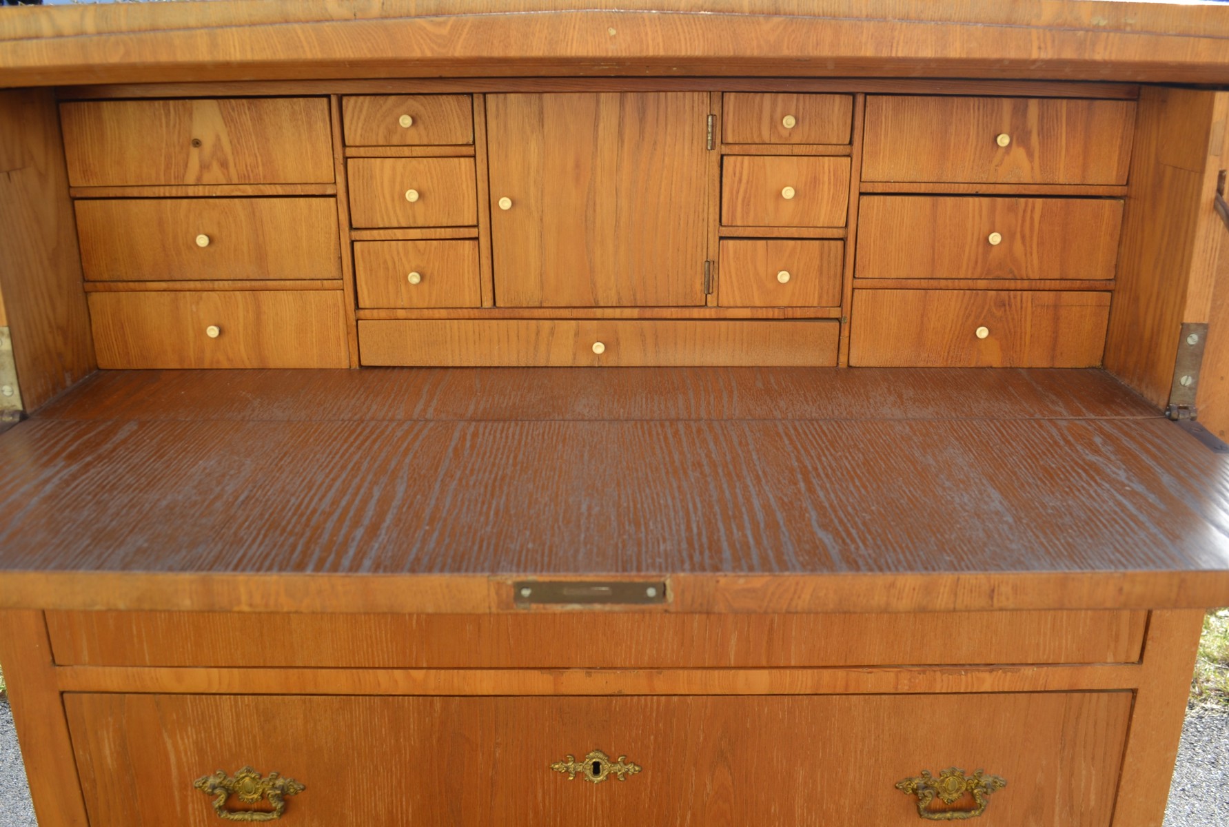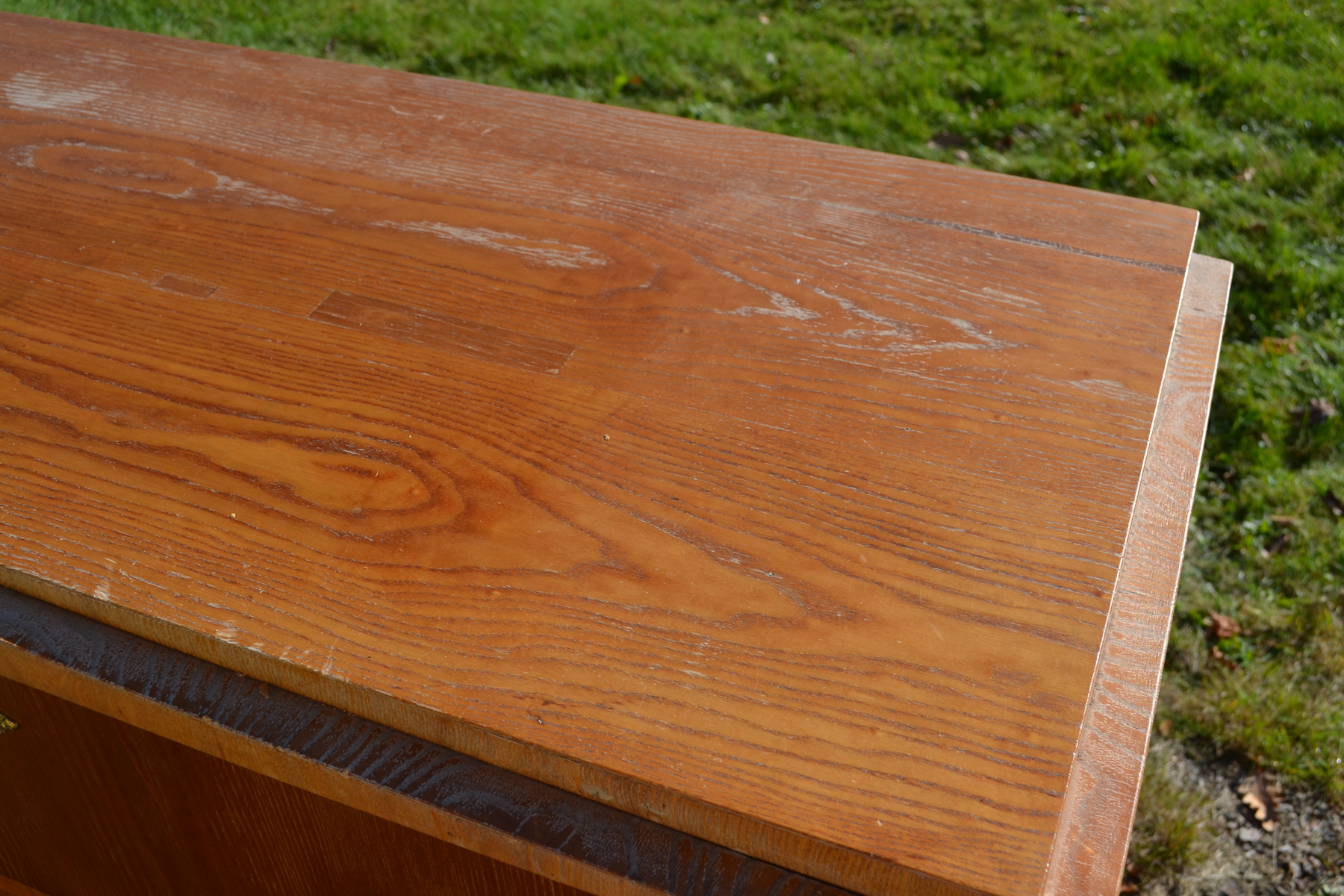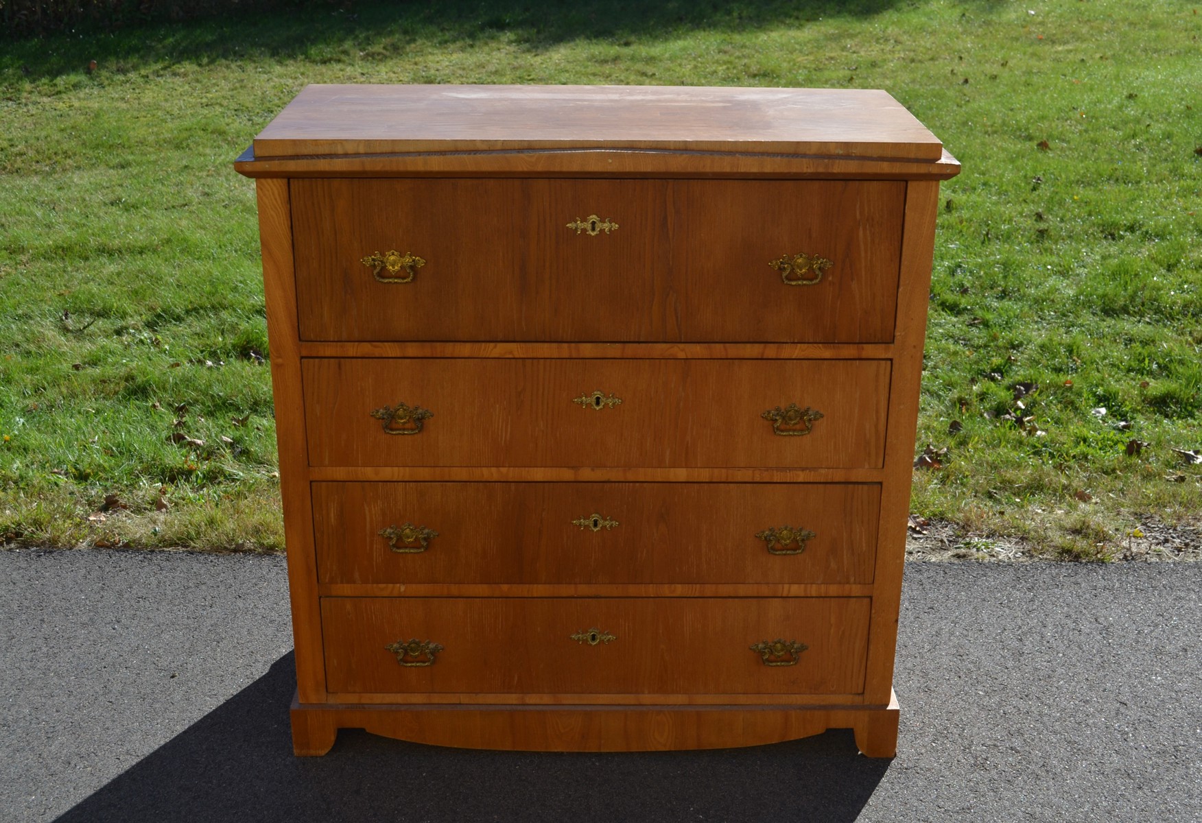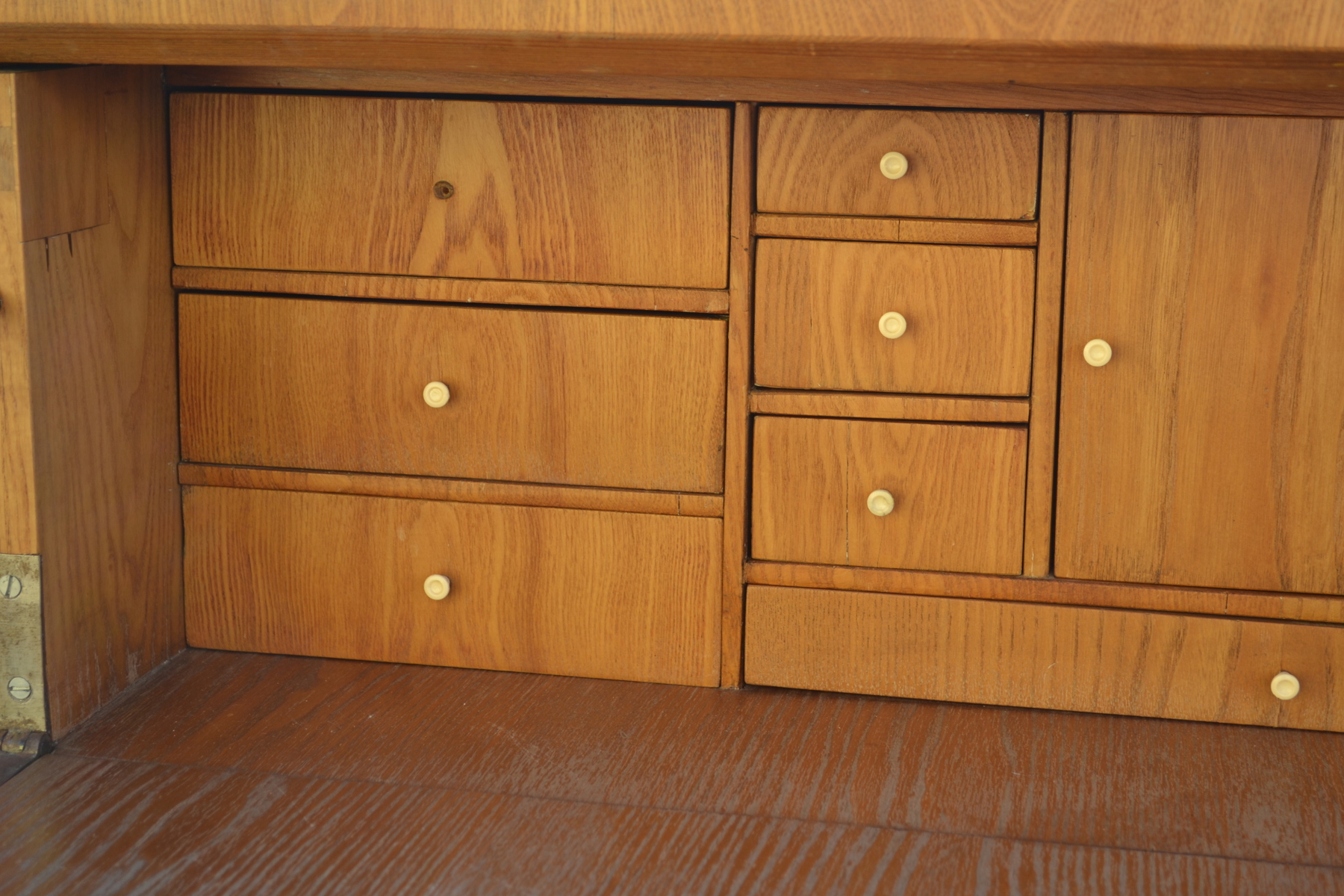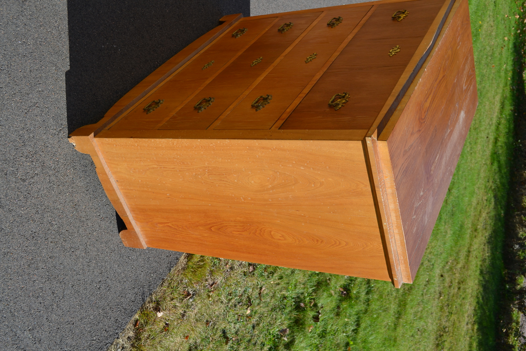 Ålderslitage, faneravslag, en knopp saknas på en innerlåda, en plugg saknas till ett gångjärn.