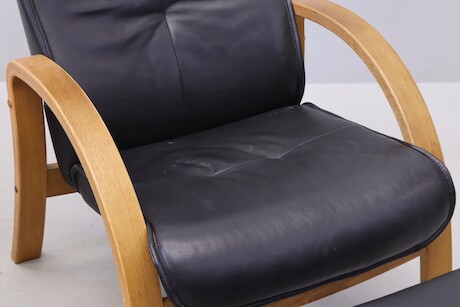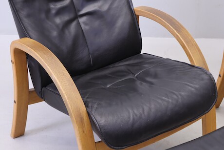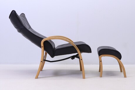 Bilder Fåtöljer ett par med fotpallar "Easy" Conform, 2000-tal, böjträ, klädda i skinn, ställbar rygg