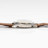Ljus urtavla med målade stiliserade arabiska index, subsekund kl. 6, silverfärgade visare med lysmassa
