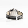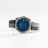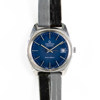 Blå urtavla med vertikal slipning, datumvisning kl. 3, silverfärgade visare med vita inlägg och lysmassa