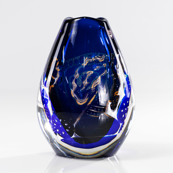 Edvin Öhrström, lökformad vas med ojämnt avslutad mynning, arielteknik med mörkblårr underfång, "Flickan & Duvan", signerad "Orrefors, 957913, Edvin Öhrström, Ariel Gallery 59-87, Orrefors, etikettmärkt höjd 19 cm