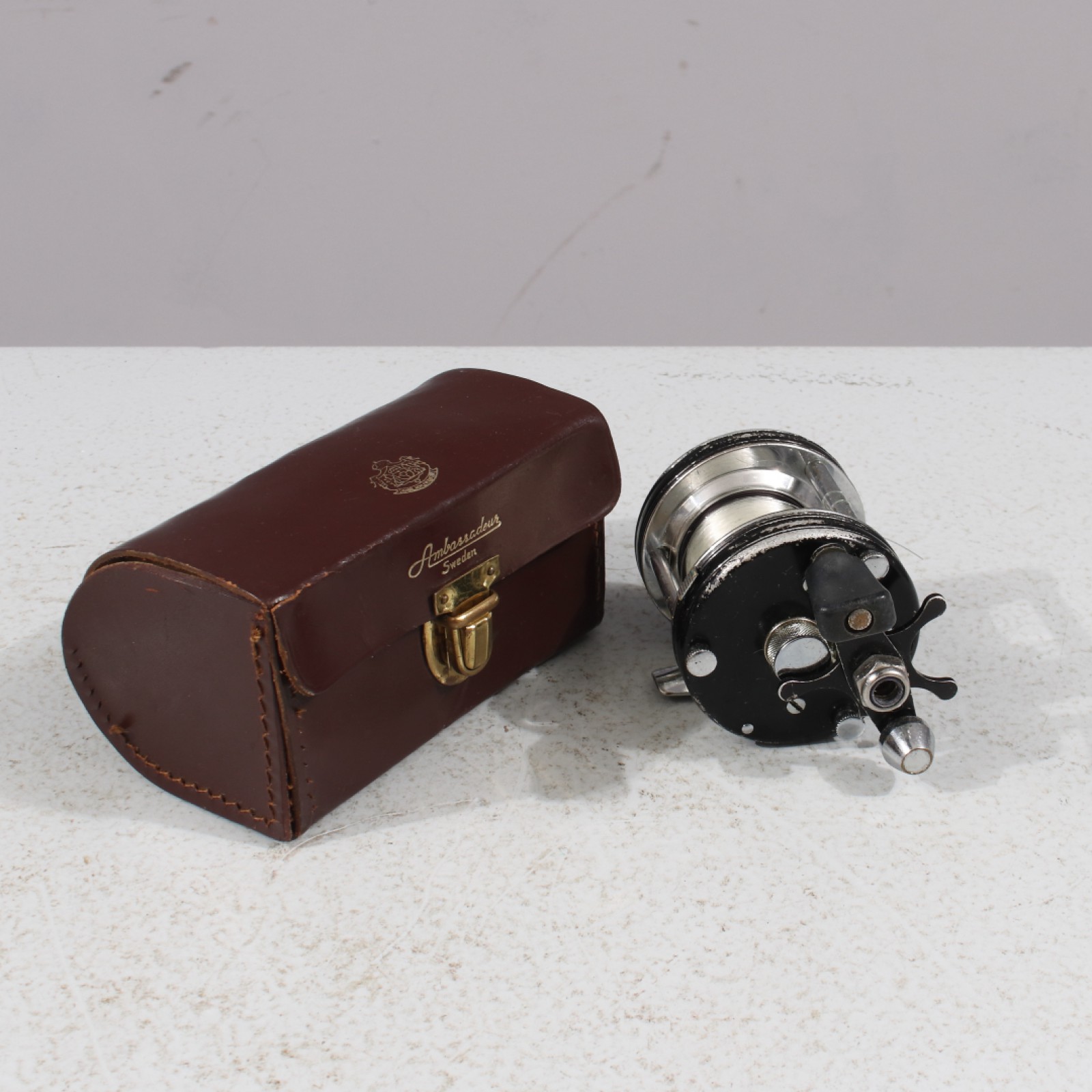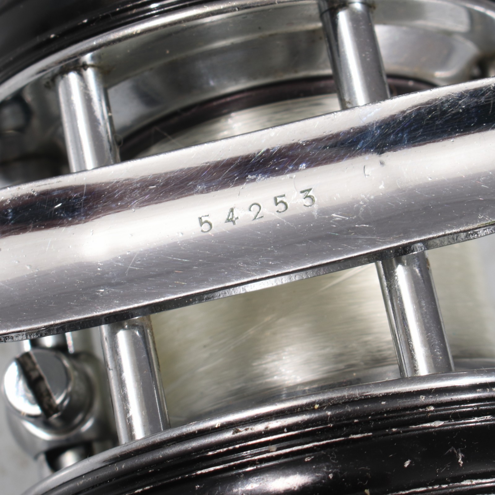 Spinnrulle, Nummer under fot 54253, fodral medföljer, bruksslitage, fodral ställvis med spruckna sömkanter. (vån3)