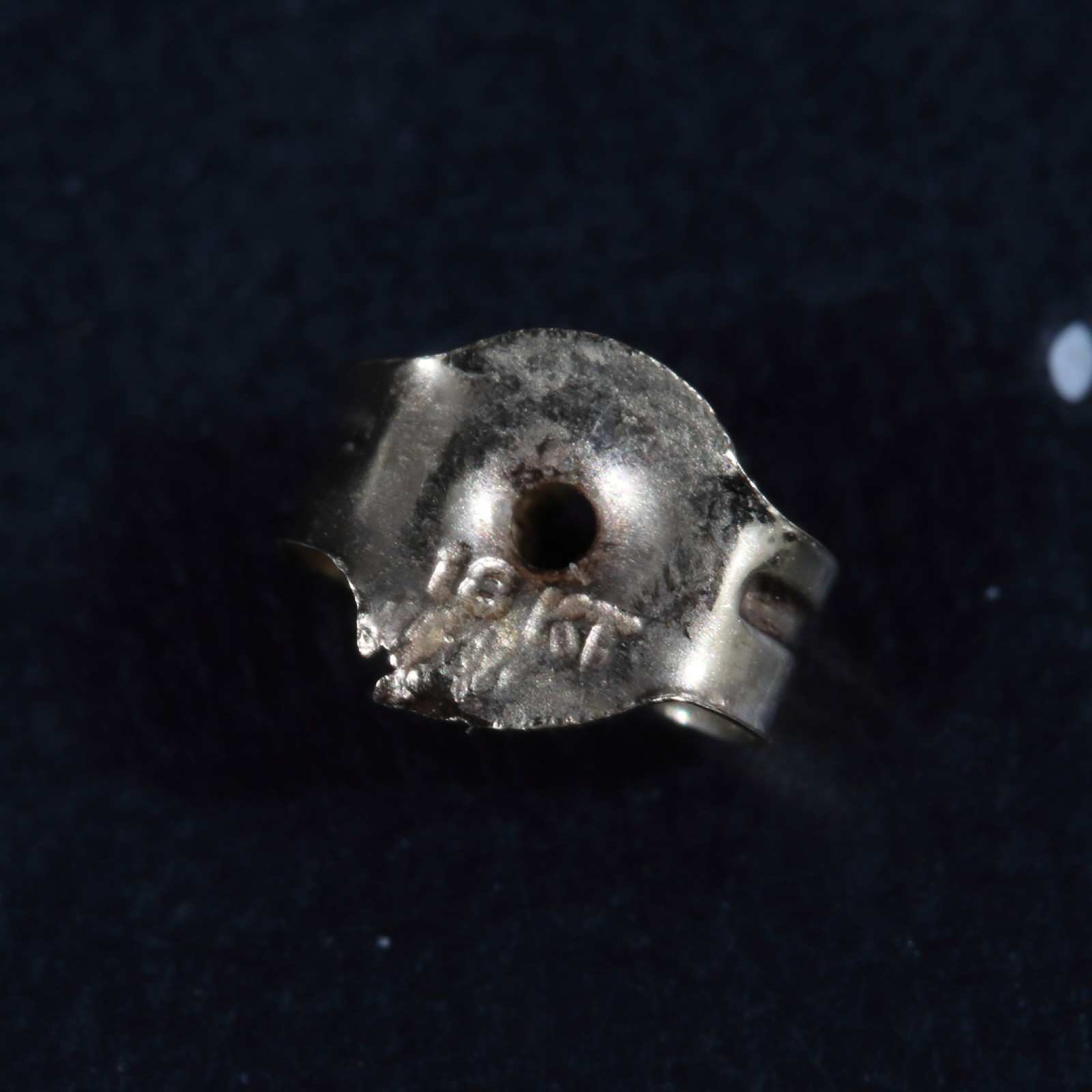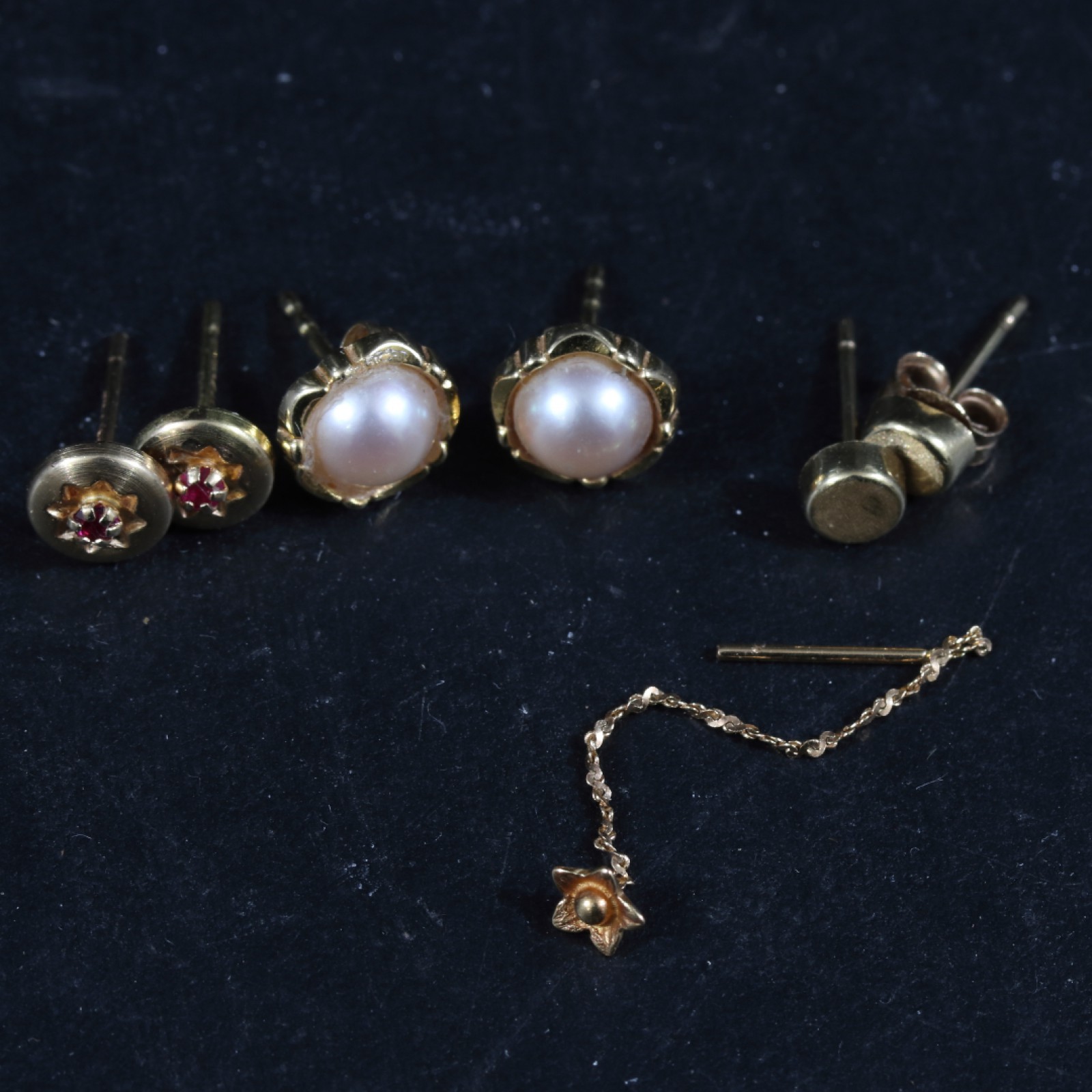 7 stycken (3 par samt 1st udda), 18 karat guld, 1 par med pärlor samt 1 par med små röda stenar, 3st pluppar saknas, diameter 4-8 mm, bruttovikt 2,20 gram. (vån3)