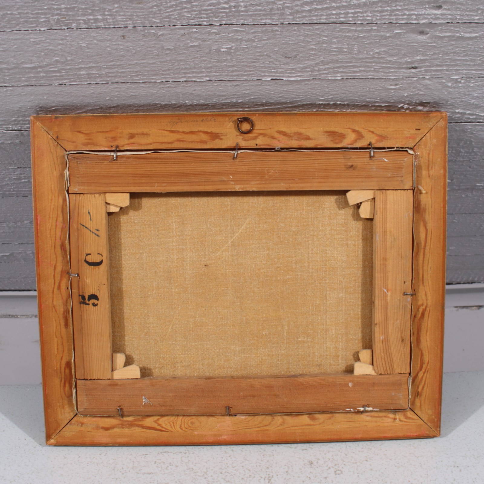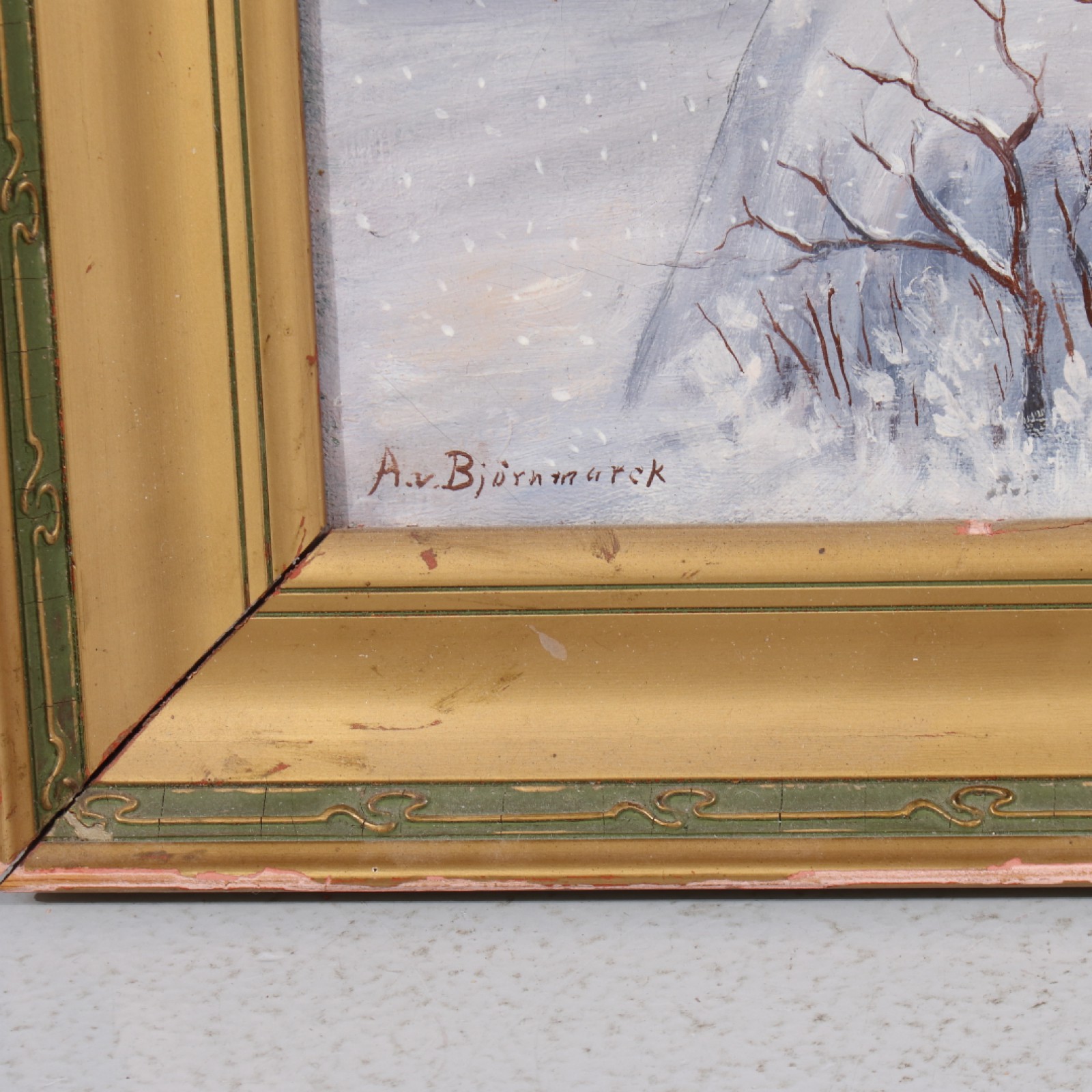 Äldre oljemålning på duk, "Promenad i snöväder", signerad A.v. Björnmarck, duk med mindre färgbortfall, ram 35,5x43,5 cm, bild 26,5x34,5 cm. (vån3)