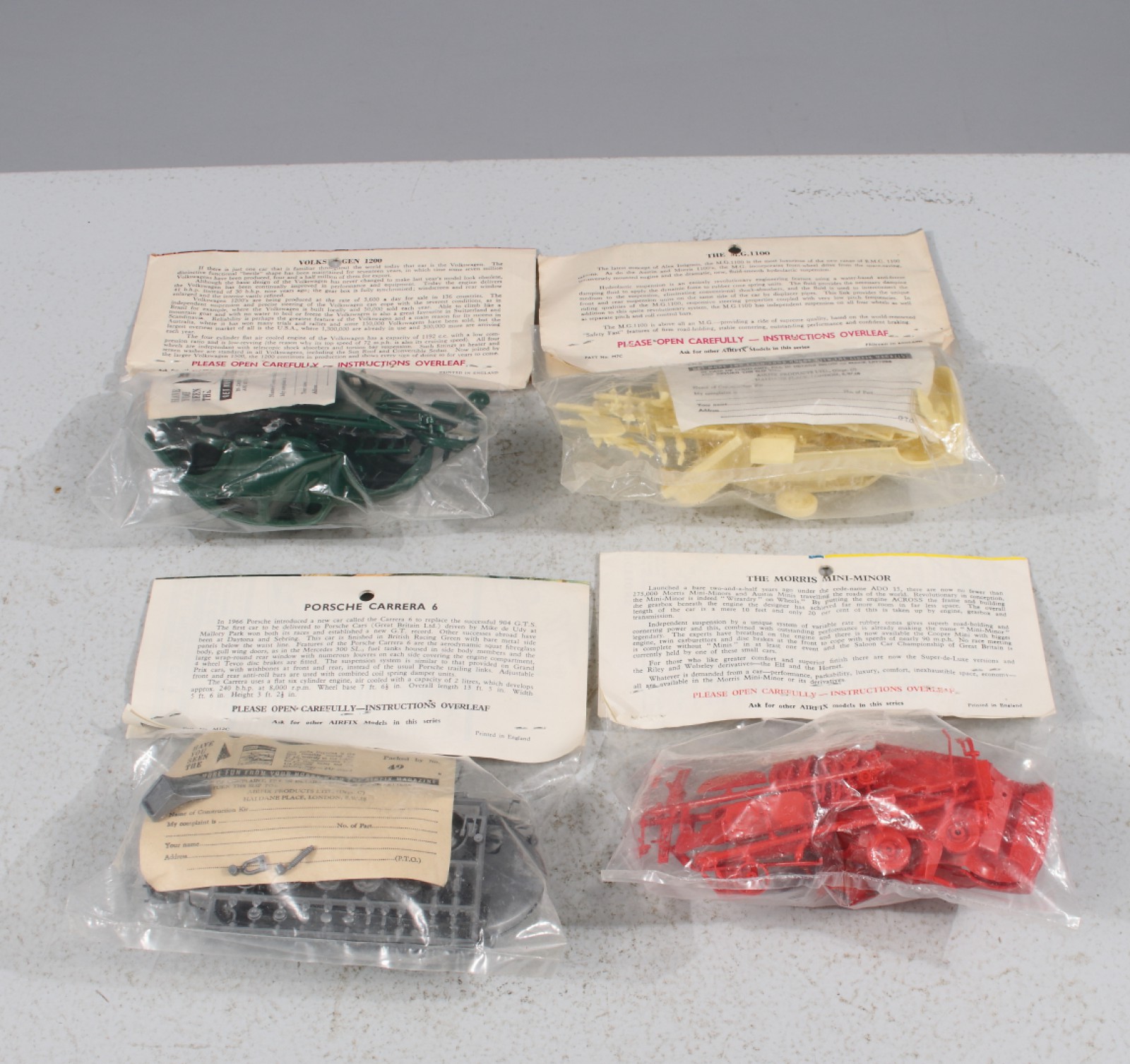 4 stycken, plast, 1960-tal, Porsche Carrera 6 (komplett), Morris Mini Minor (komplett), Volkswagen de lux sedan (1st främre blinkers saknas) samt MG 1100 Salon (några delar saknas), öppnade och genomgågna, skala 1:32. (vån3)