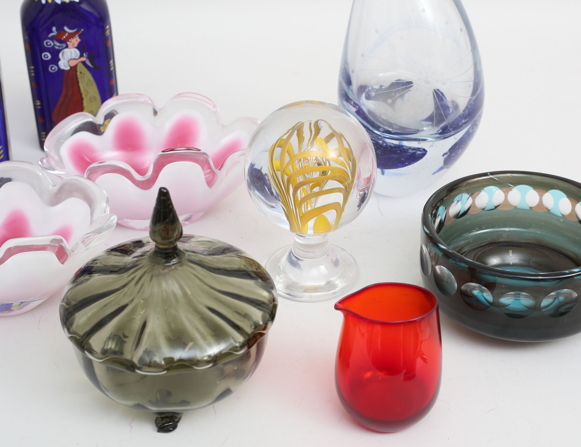 2 flaskor med metallpropp, Gullaskruf 1900-tal, allmogemotiv, höjd 17, vas signerad Milan Voruba Gusum, höjd 20, 1 par skålar Coquille Flygsfors, bredd 16, skål Ove Sandberg diameter 12, brevpress höjd 12, bonbonjär höjd 13 möjligen Gullaskruf, gräddkanna möjligen Reijmyre höjd 8