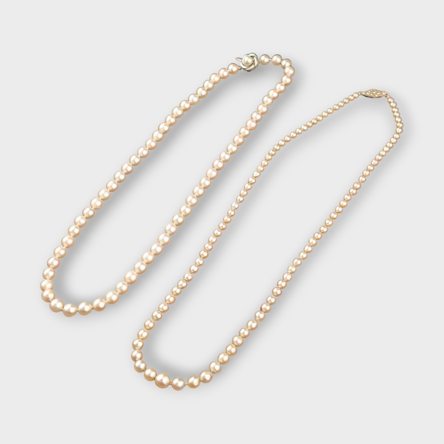 2 pärlshalsband med silverlås, saltvattenspärlor