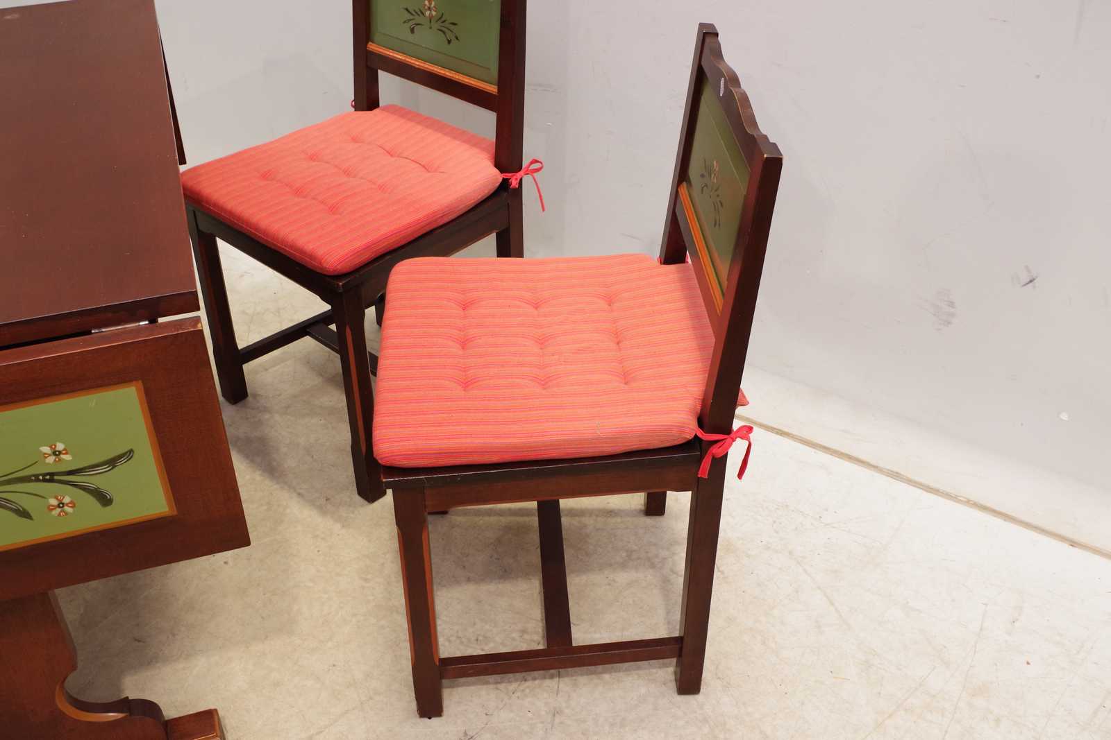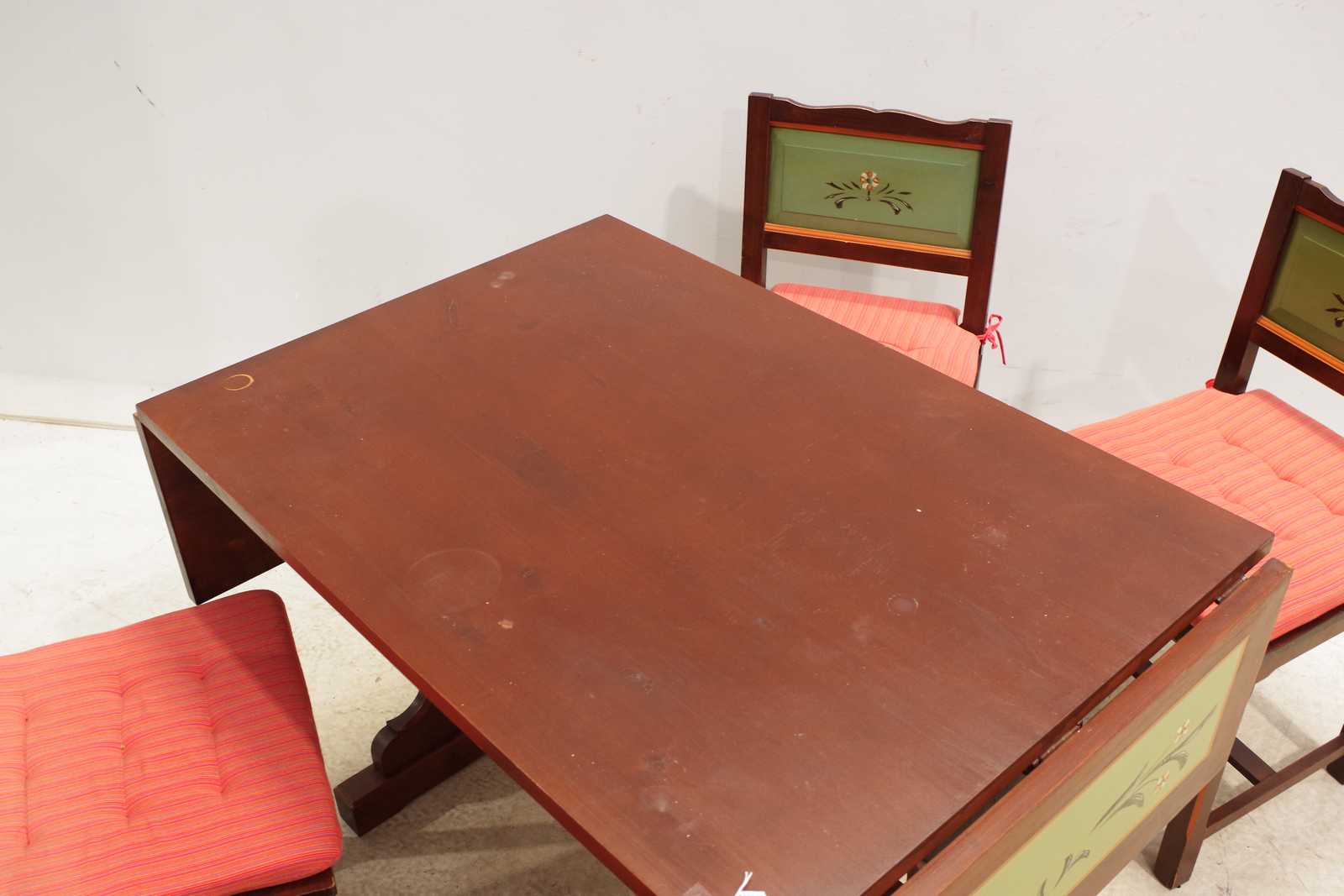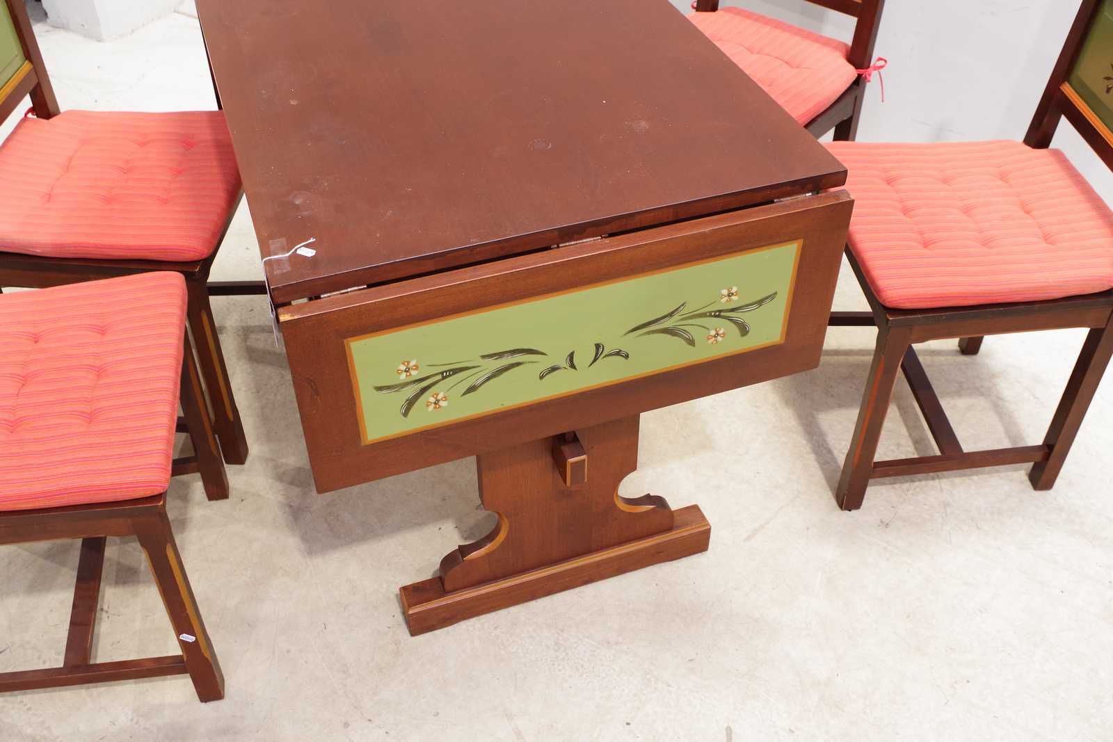 Bilder BORD MED 4 STOLAR. Mått bord H: 75cm, B: 70cm, L: 100+28+28 cm. Märken och slitage.