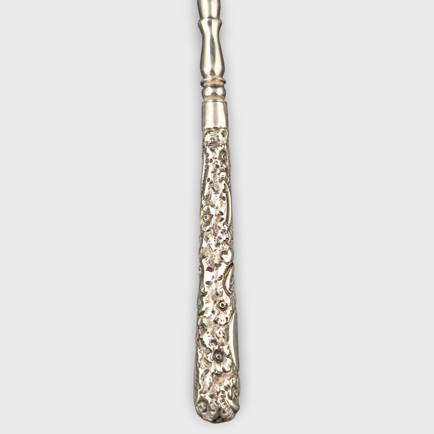 Knappkrok med handtag i silver med relief dekor, krok/skaft i metall, England