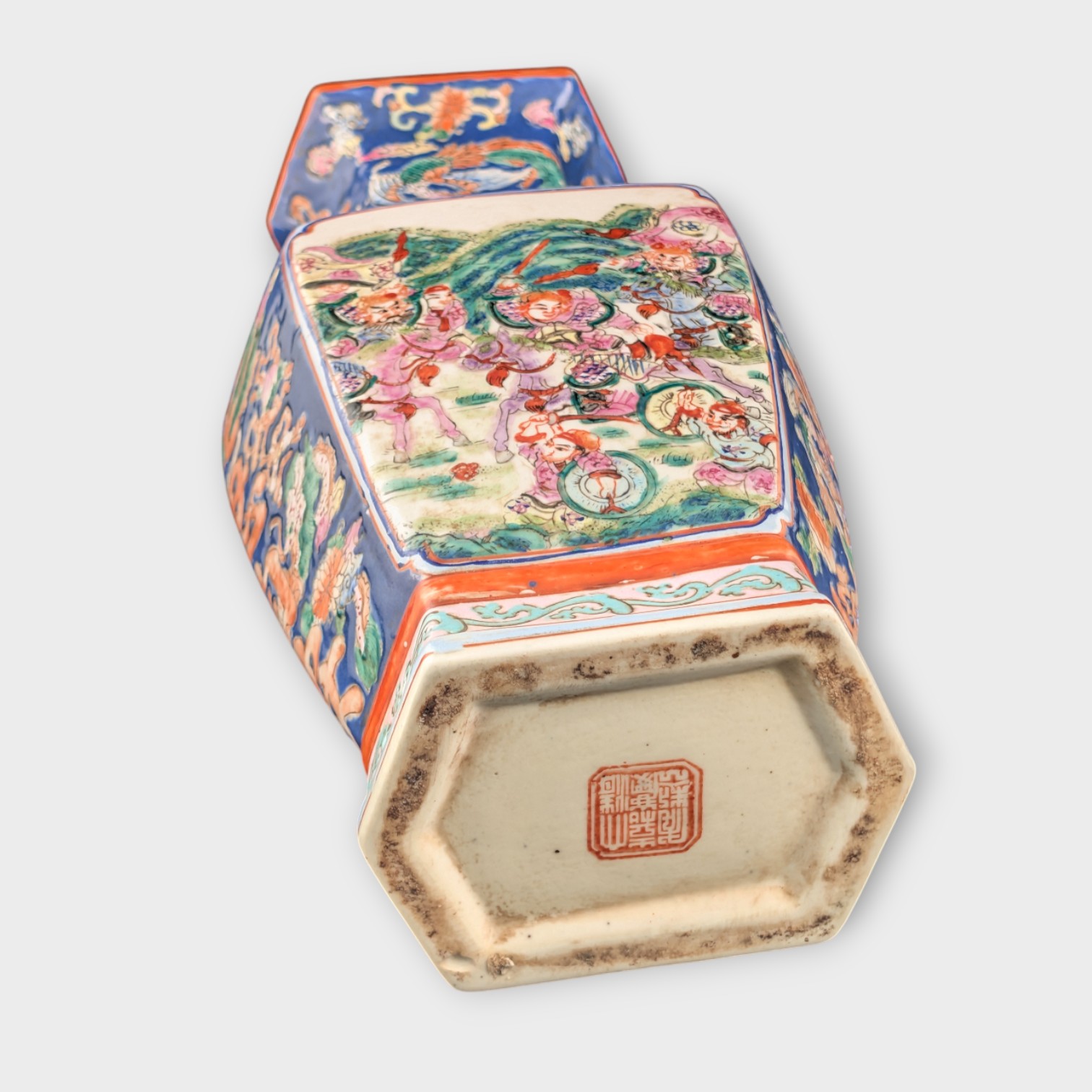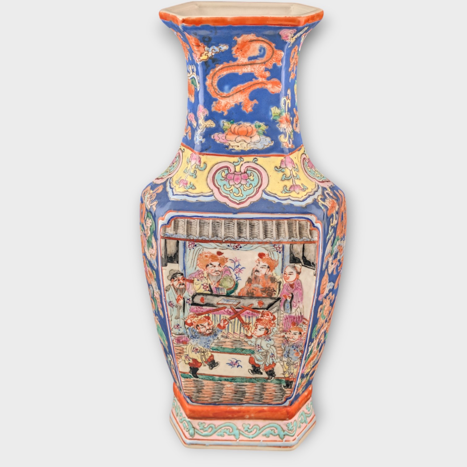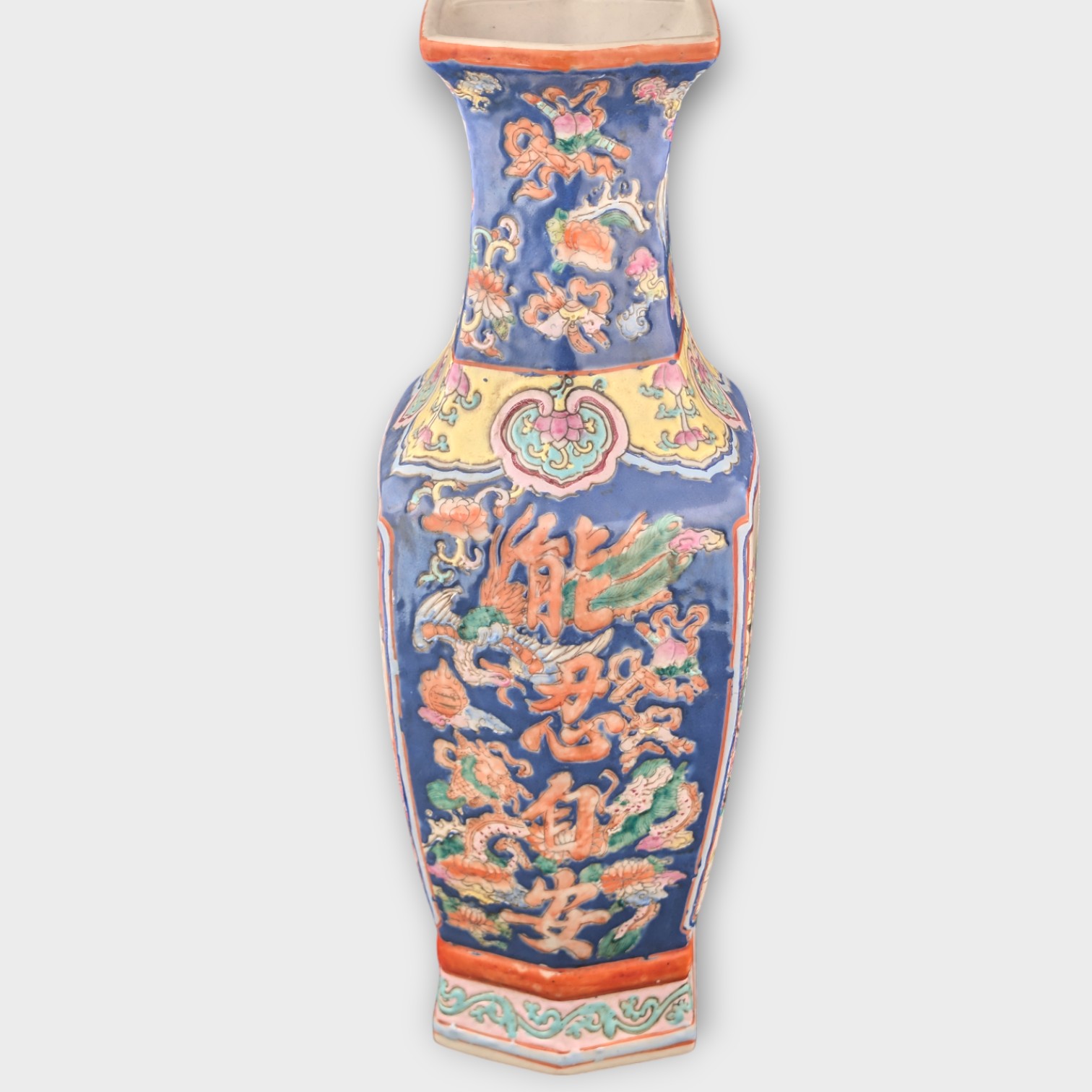 Famille rose-stil, 1900-tal. 6-kantig, drakmotiv och stiliserade blommönster mot en koboltblå bakgrund
