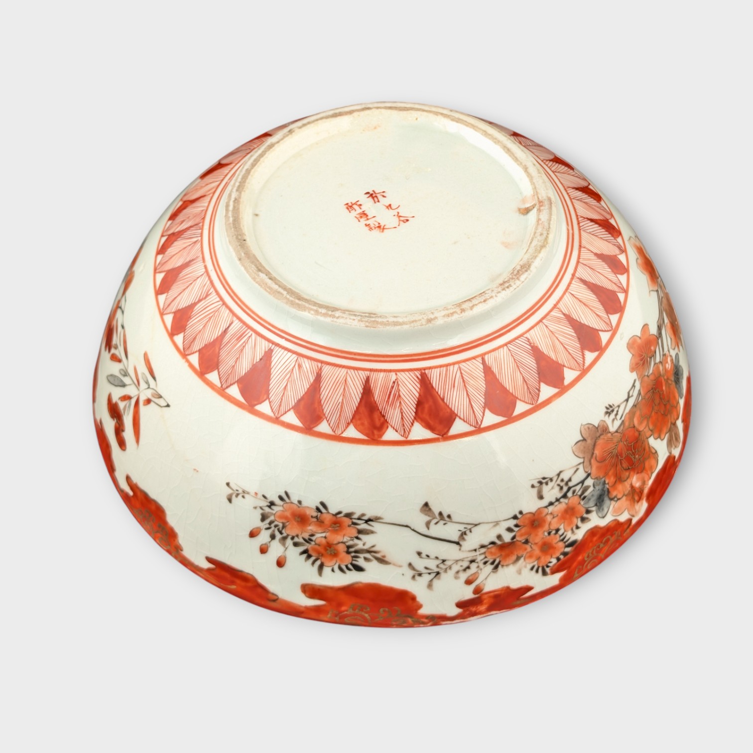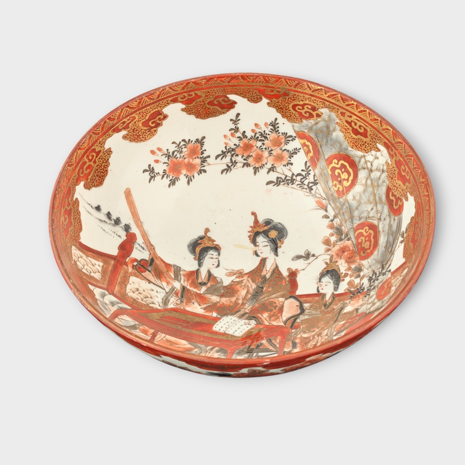 Kutani-yaki skål med centralt motiv av tre kvinnofigurer, troligtvis sent 1800-tal