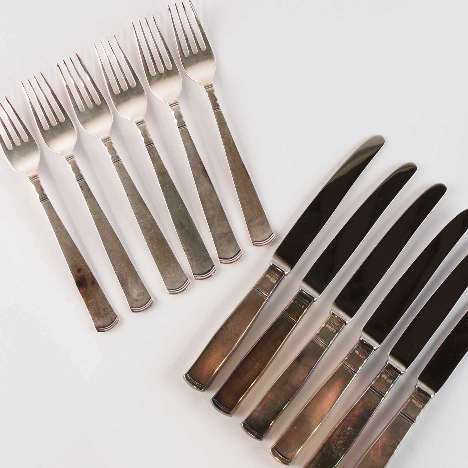 BESTICKUPPSÄTTNING smörgåsbestick, silver. Rosenholm. 377 gram totalt, knivar är silver/rostfritt. L:13,8cm gafflar, L:16,6cm knivar.