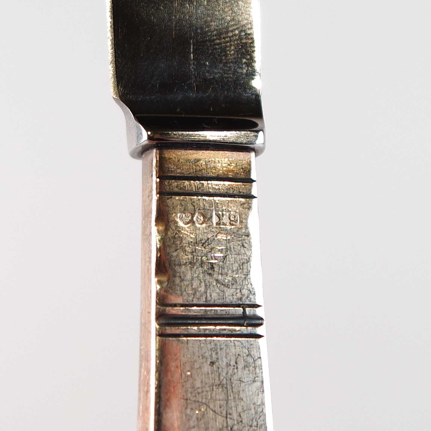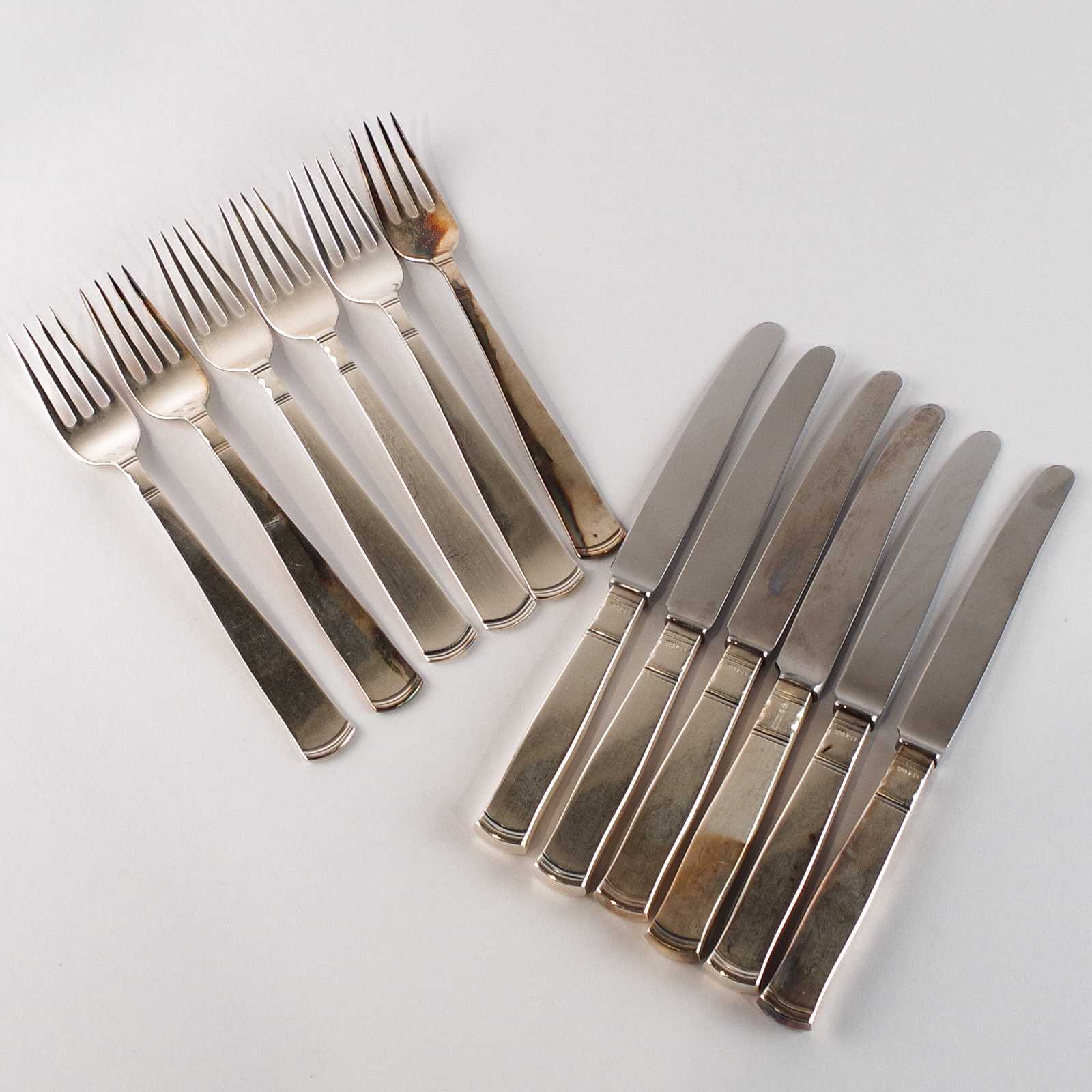 Bilder BESTICKUPPSÄTTNING silver. Rosenholm. 594 gram totalt, knivar är silver/rostfritt. L:17,7cm gafflar, L:20cm knivar.