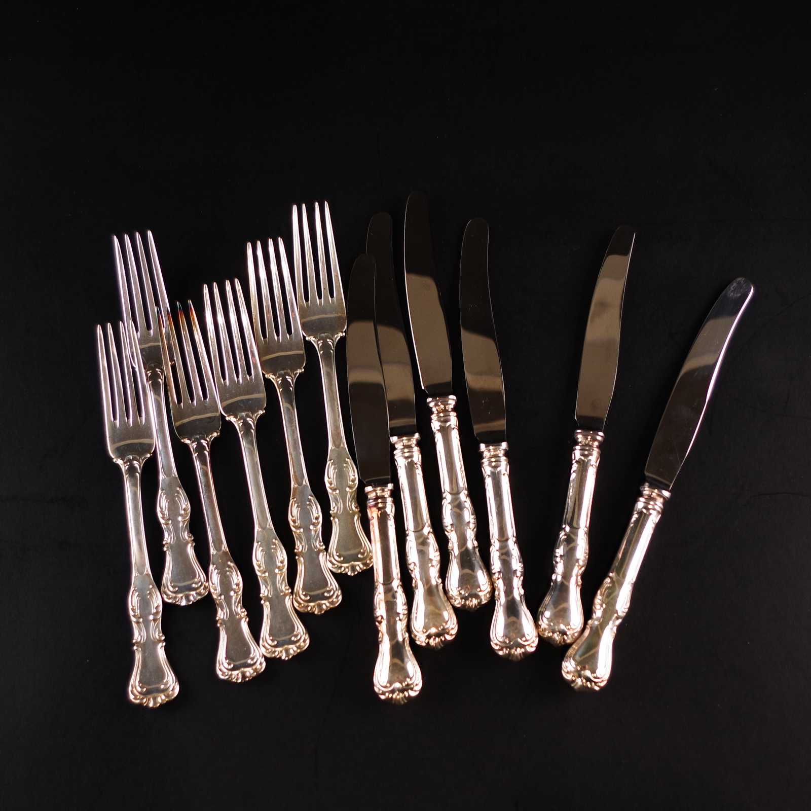 BESTICKUPPSÄTTNING silver. Prins Albert. 721 gram totalt, knivar är silver/rostfritt. L:17,8cm gafflar. L:22cm knivar.