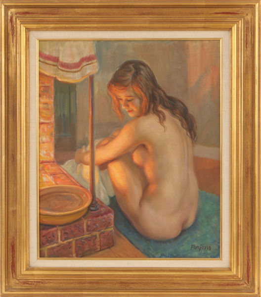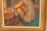 Olja på duk, naken kvinna vid eldstad. Signerad.