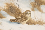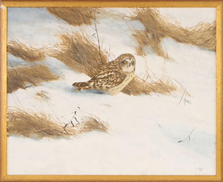 Olja på duk, vinterbild med jorduggla. Signerad och daterad 02.
