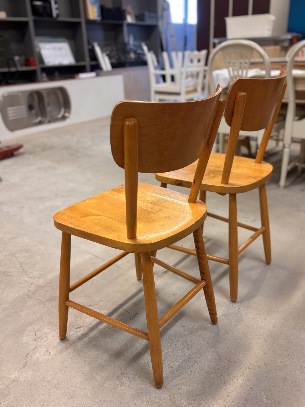 Charmigt par svenska pinnstolar i massiv björk, tillverkade under 1950–60-talet.Typisk skandinavisk formgivning med svagt svängd rygg och rundade ben med tvärstag.Vacker gyllene ton i träet och gedigen hantverkskvalitet.Perfekta som köksstolar, skrivbordsstolar eller som ett inslag i en retroinspirerad inredning.