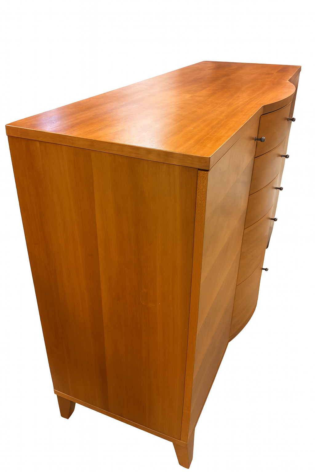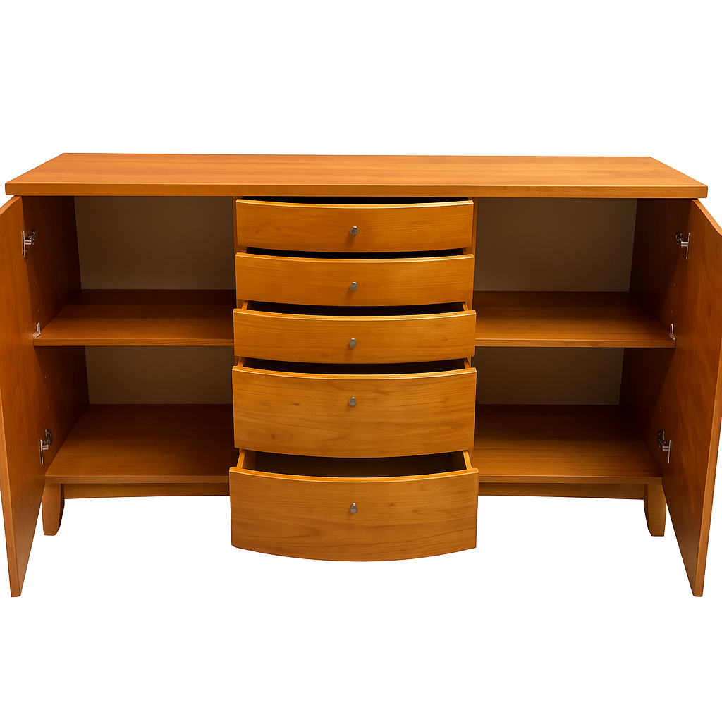 Elegant och gedigen byrå i körsbärston med fem lådor i mitten och två dörrar på sidorna, bakom vilka finns hyllplan för extra förvaring.Byrån står på fasta ben och har små, diskreta metallknoppar som handtag.