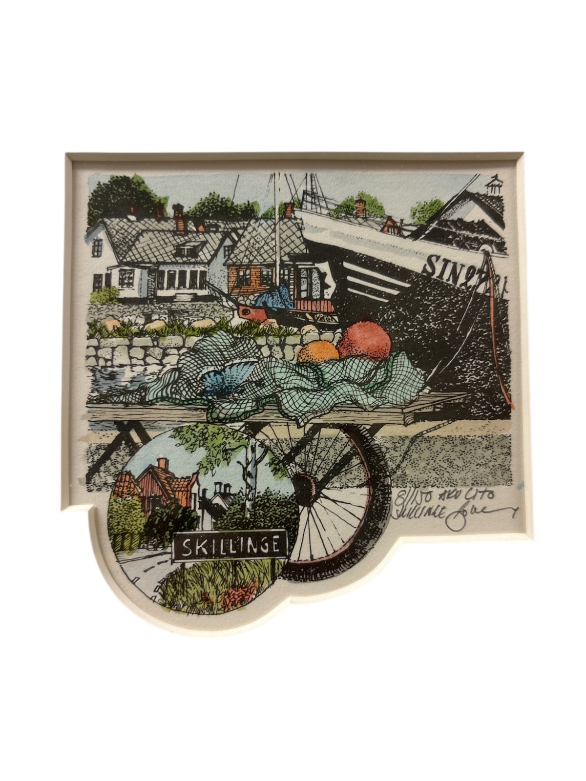Vacker färglitografi av Bo Olsson, föreställande den idylliska fiskebyn Skillinge på Österlen.Motivet visar den välkända bygatan med husen och en cykel i förgrunden – en typisk scen från Olofssons uppskattade Skåneserie.Verket är handsignerat, numrerat och daterat 1986, och monterat i vit passepartout med metallram.