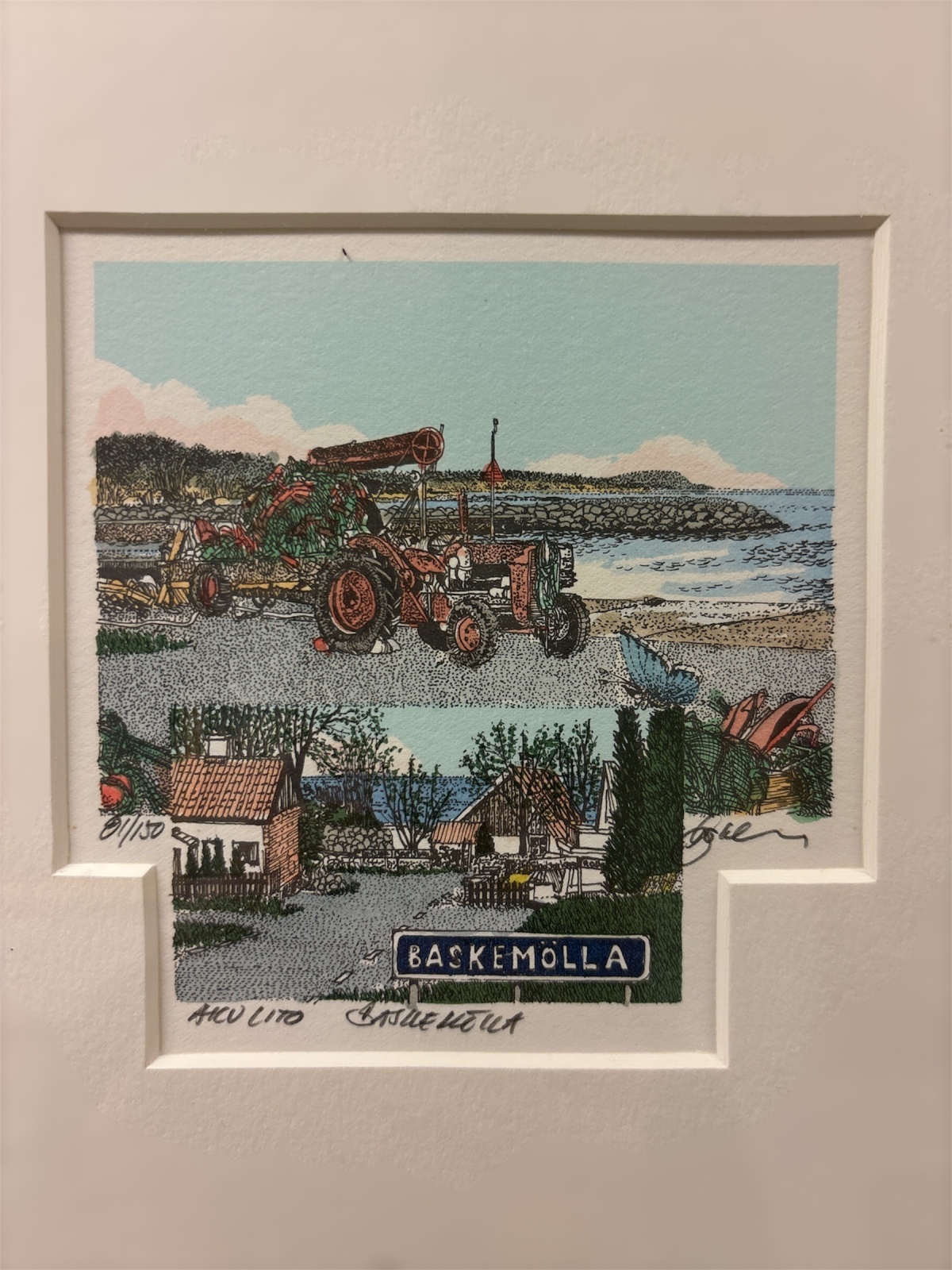 Vacker och detaljrik färglitografi av Bo Olsson, föreställande kustbyn Baskemölla på Österlen.Motivet visar ett levande skånskt landskap med havet i bakgrunden, traktor och byhus i varma färgtoner.Verket är handsignerat, numrerat och daterat 1986.