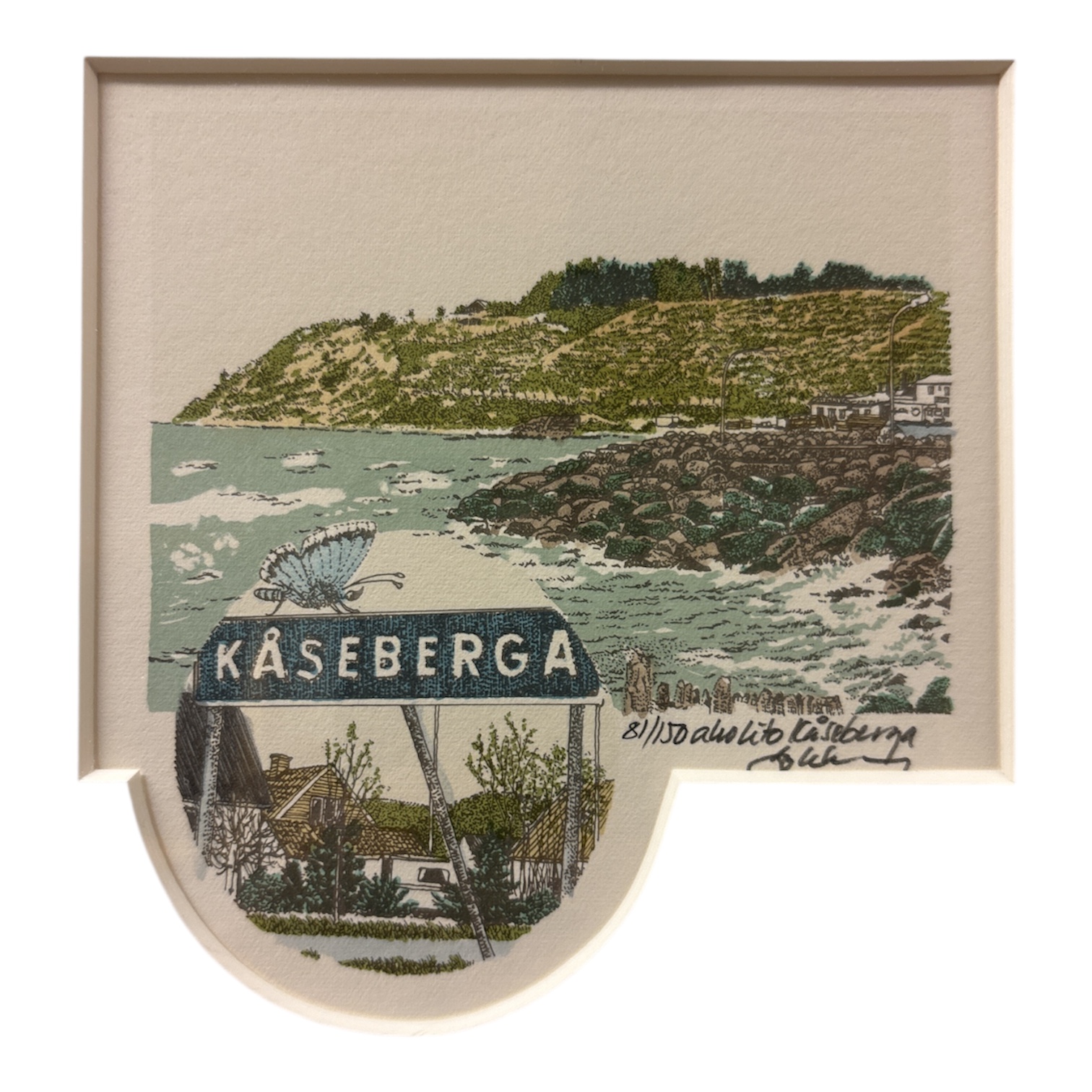 Detaljrik och stämningsfull färglitografi av Bo Olsson, föreställande kustbyn Kåseberga på Österlen.Motivet visar de typiska skånska husen och den karga kusten som leder upp mot Ales stenar.Verket är handsignerat, numrerat och daterat 1986.